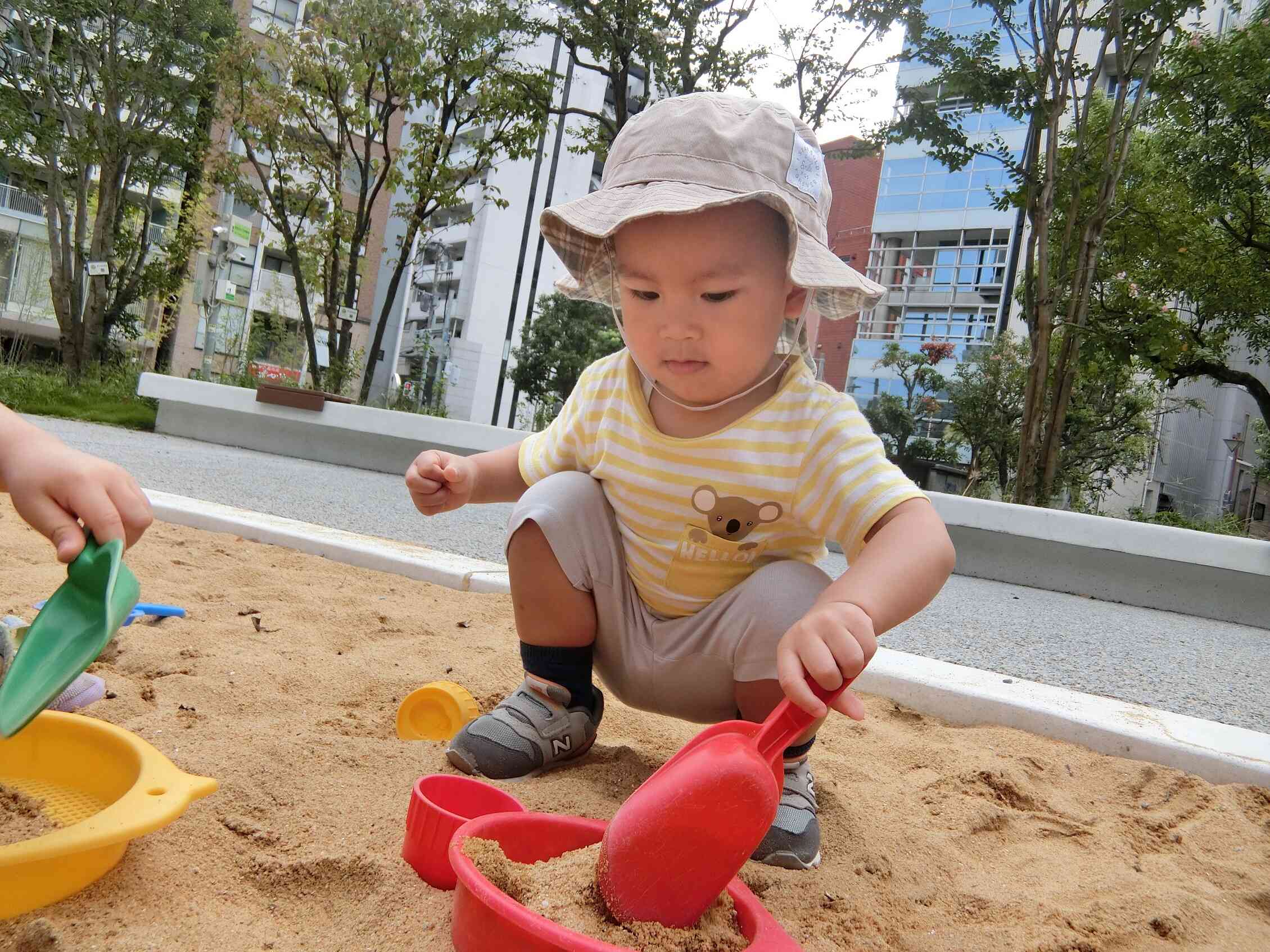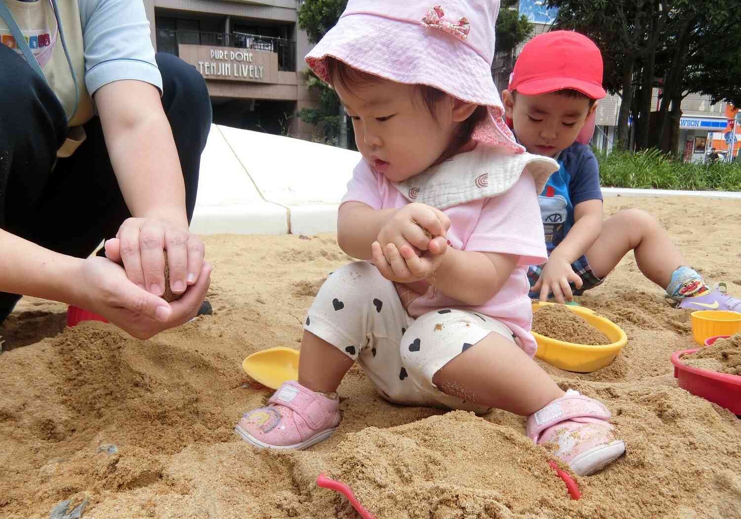 砂場では穴掘りや砂山作り、ままごとなど好きな遊びをじっくりと楽しんでいます♪