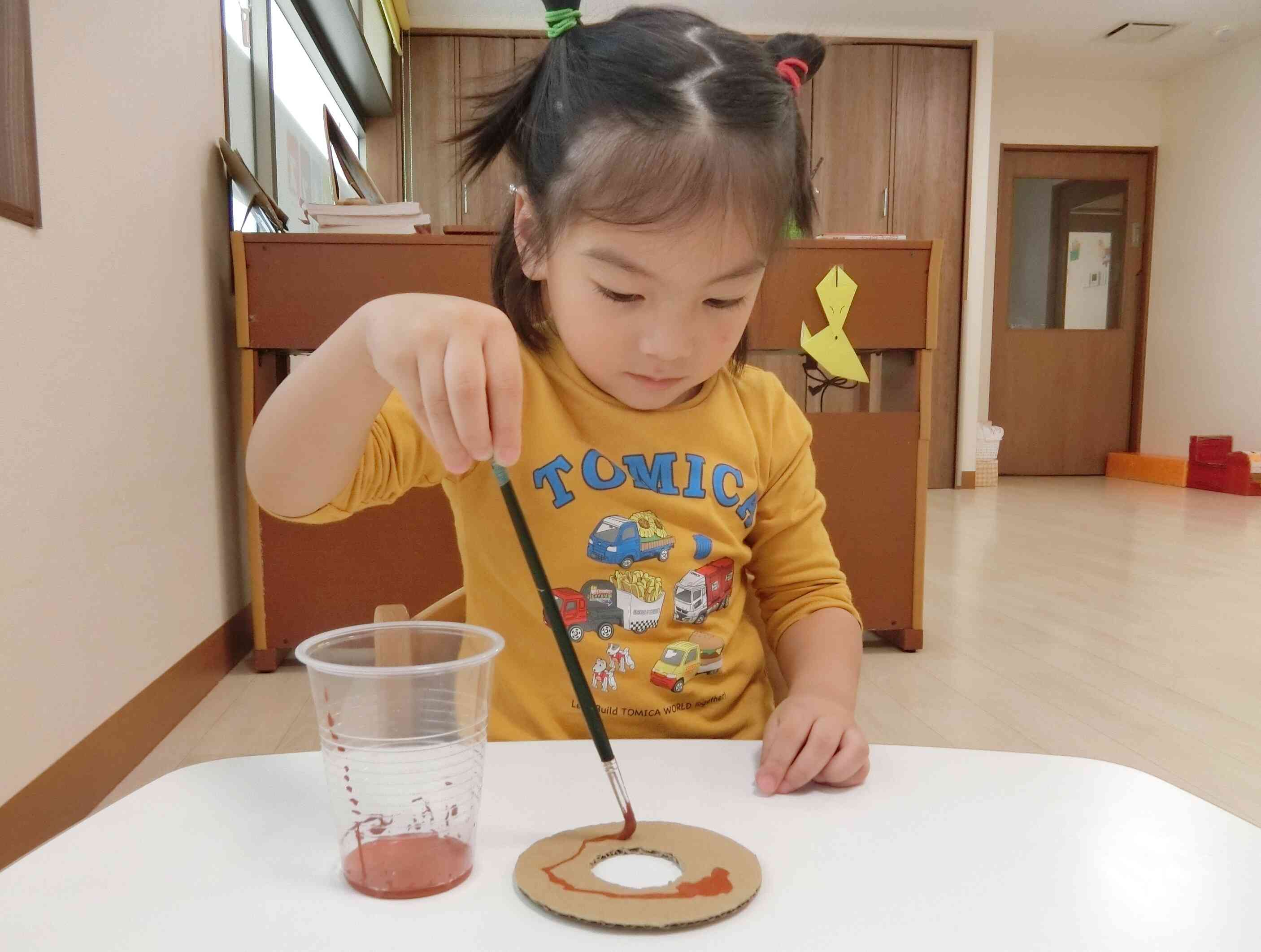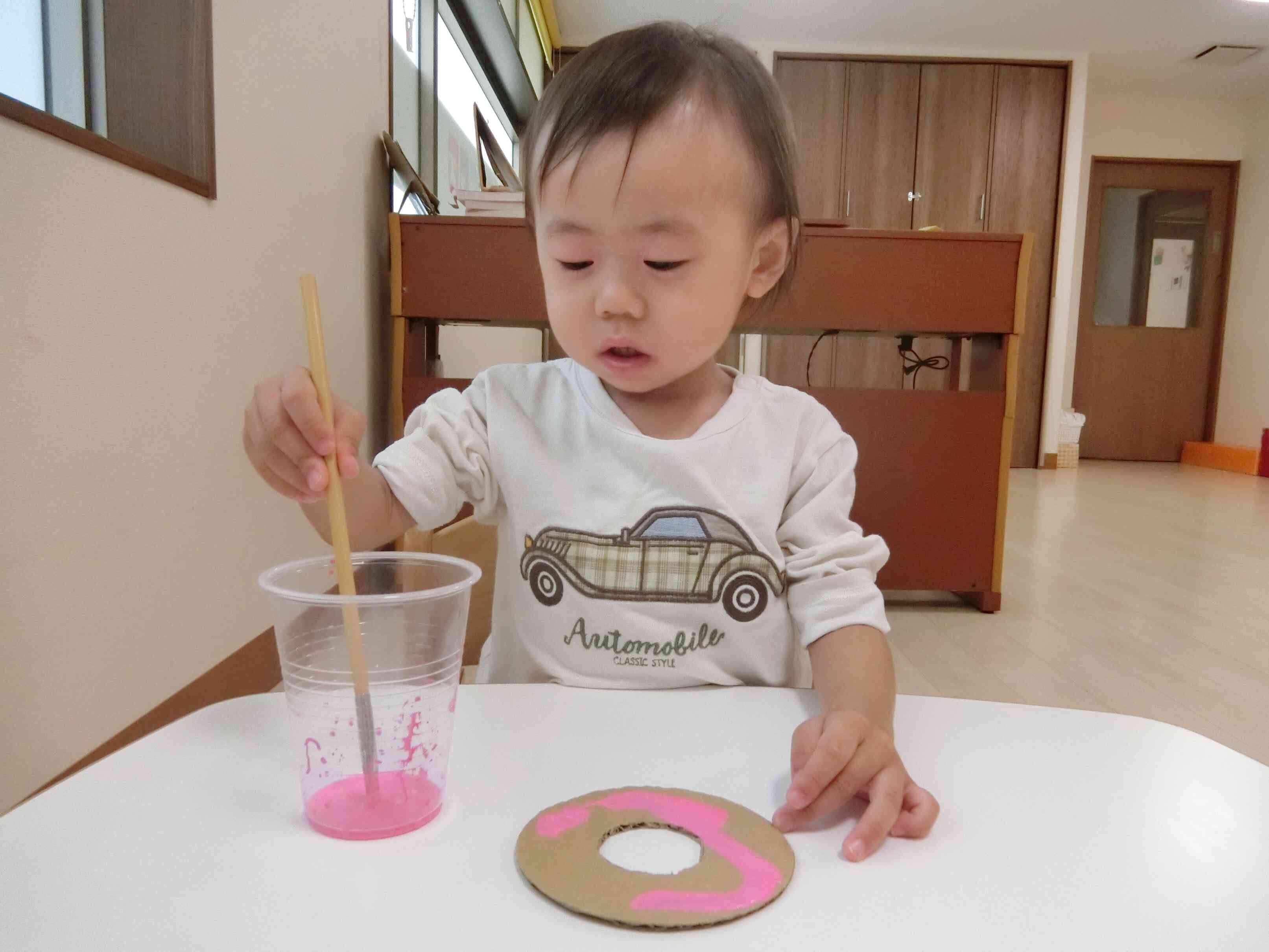 美味しそうなチョコレートに見立てた絵の具を選び、ドーナツの形にたっぷり塗って楽しみましたよ♪