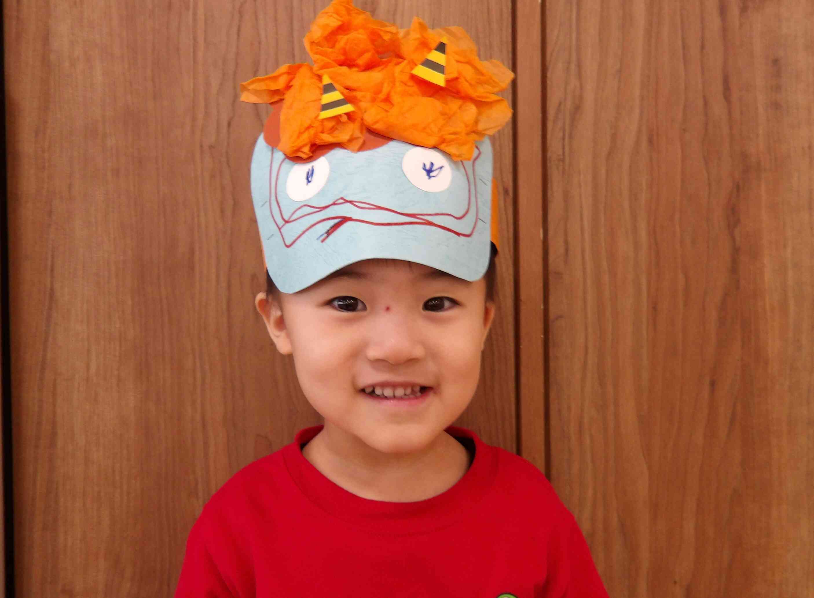 製作した鬼のお面やでんでん太鼓を身に着けて、いざ鬼退治!!