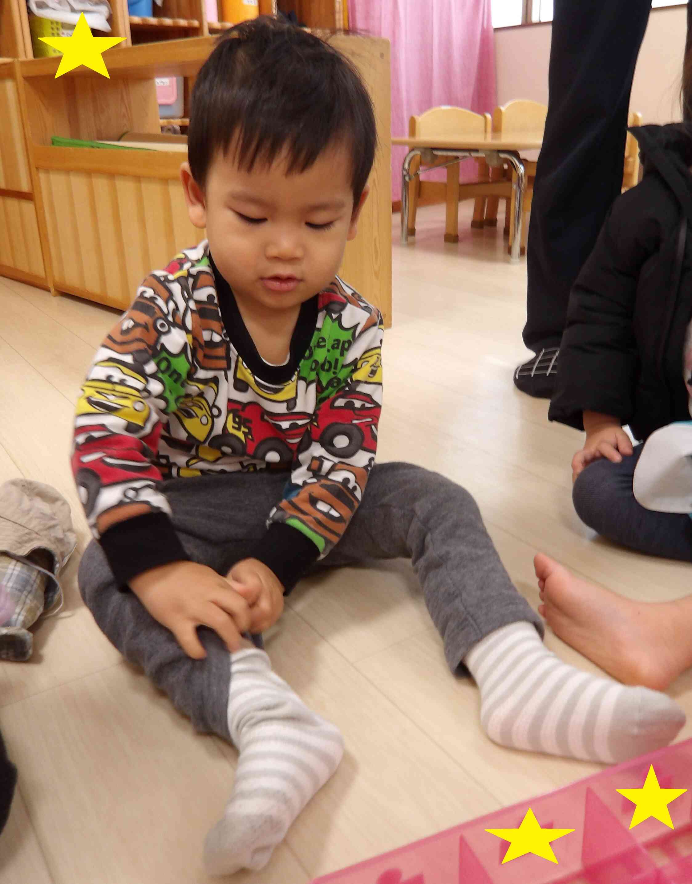 自分でしたい気持ちが強くあるものの、思うようにいかずに葛藤する姿も・・・そんな時は取り組みやすいように保育者に少し手伝ってもらうことで、自分でできた達成感を味わうことが出来ていますよ。