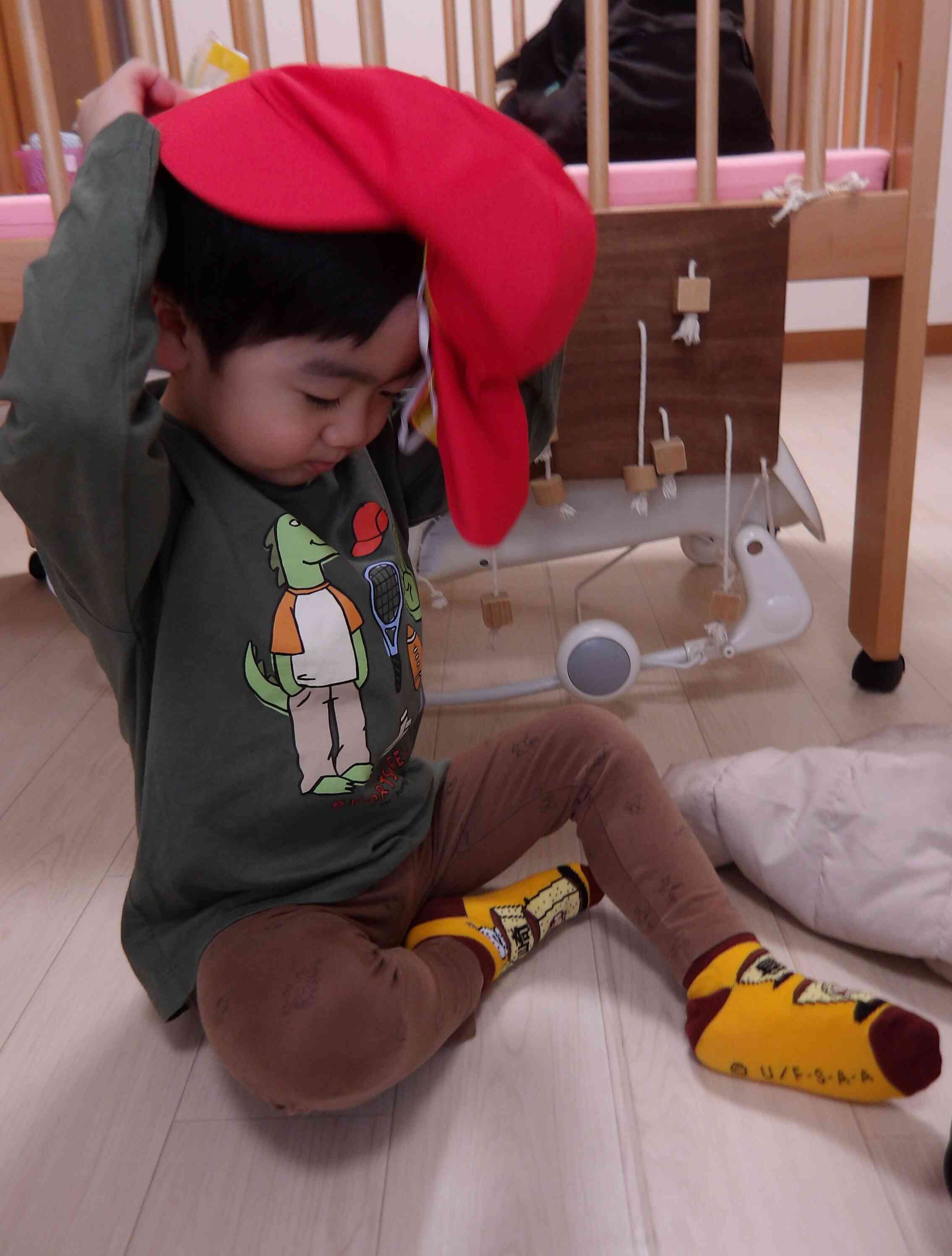 1・2歳児クラスのお友達は、着脱や簡単な身支度等を自分でできるように挑戦中です!