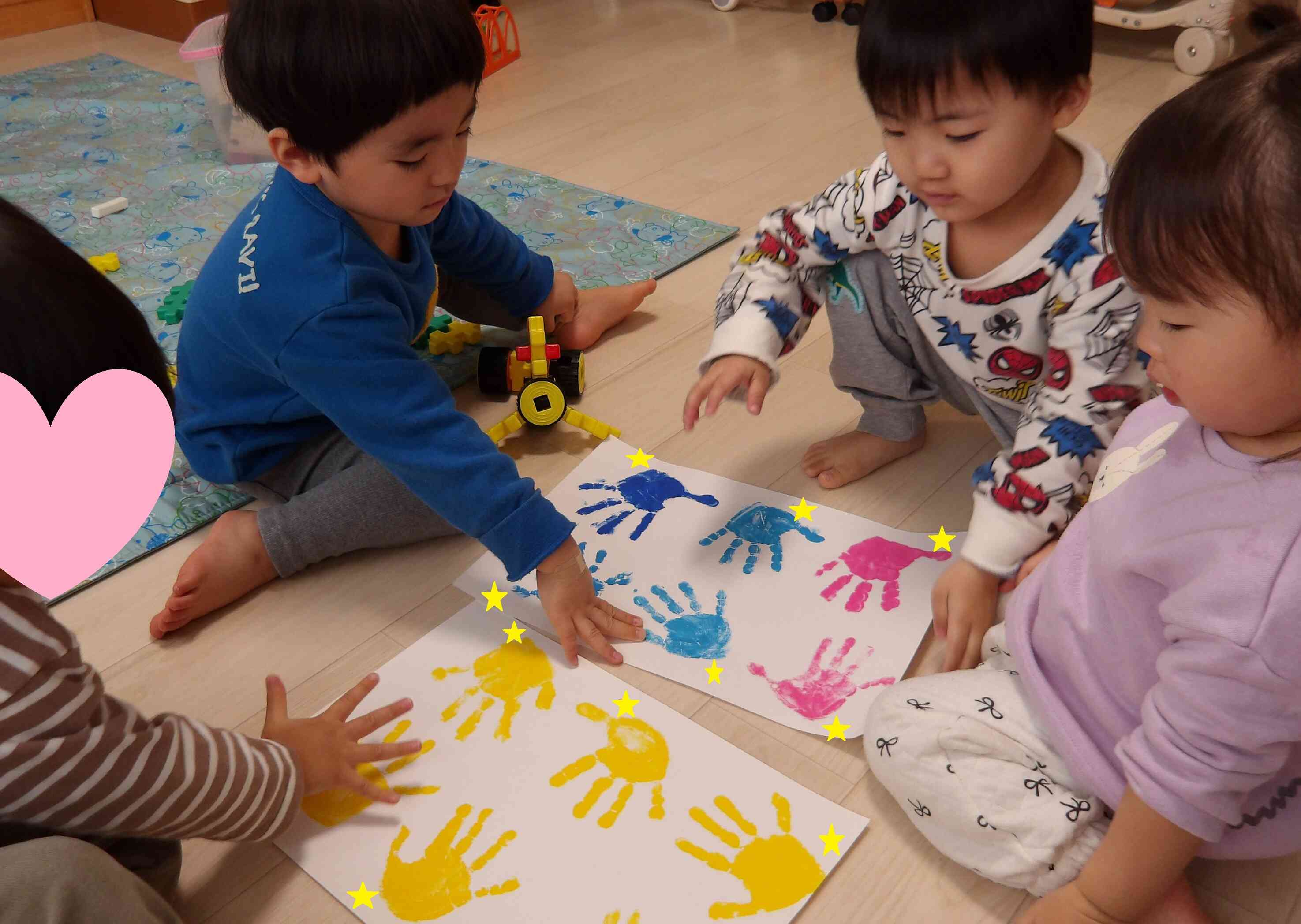 お友達の手型と大きさ比べをしたり、「○○君のお手て、いいねぇ♪」とお互いの手型を褒め合ったりする姿が微笑ましかったです。
