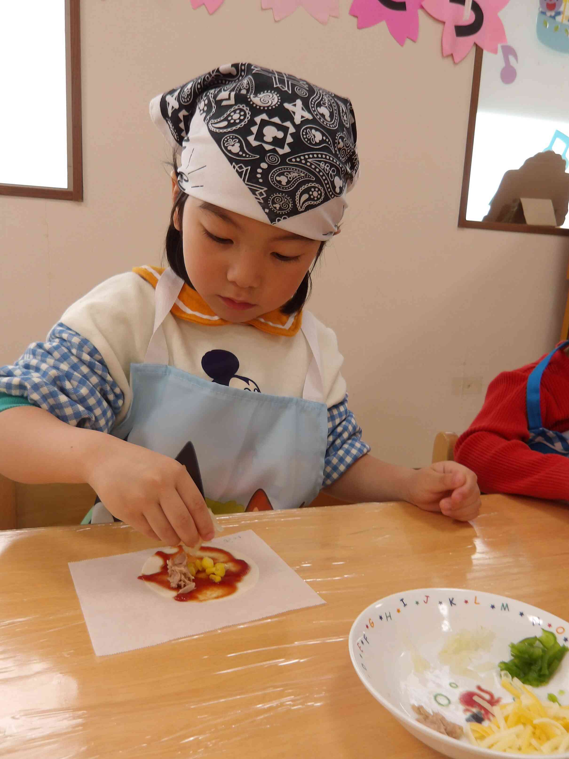 餃子の皮にケチャップを塗ったり、コーンやピーマン等の具材を乗せたりして、自分だけのオリジナルピザを作りました。