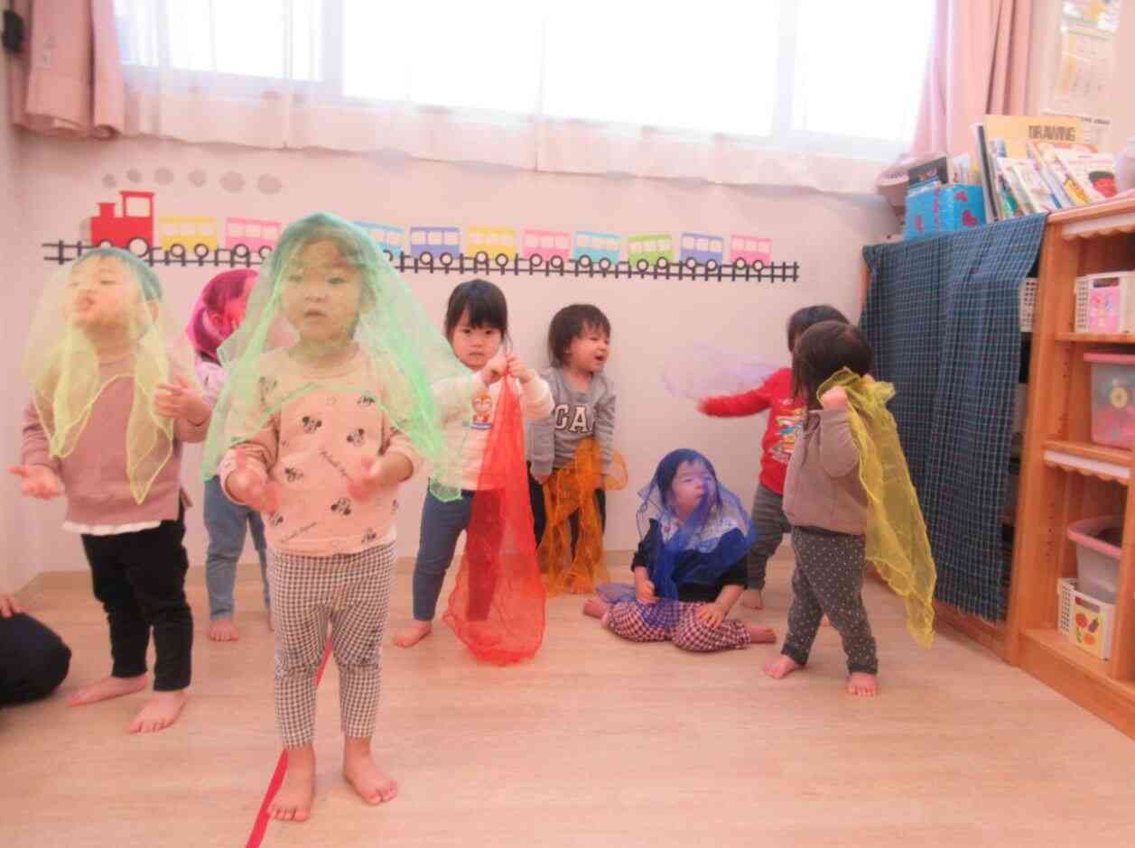 あひる組さんでシフォンスカーフを使って遊びました!「いないいないばあ」をしたりスカーフを揺らしてみたりたり・・・とても楽しかったね♡