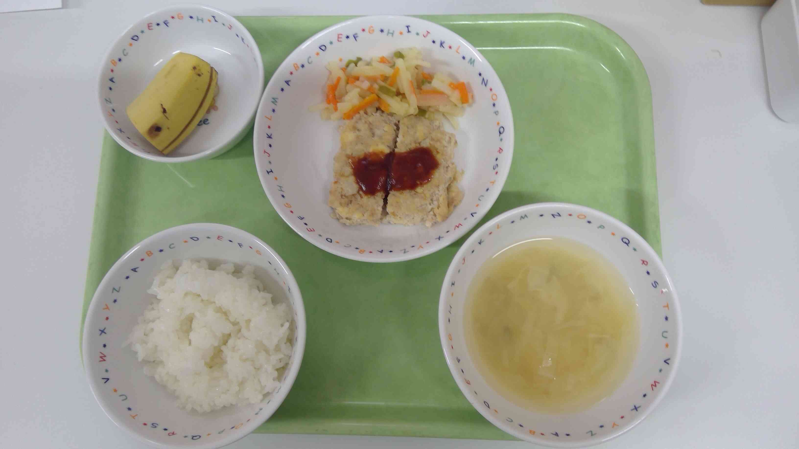 本日の献立はごはん、もやしのお味噌汁、高野豆腐のオランダ煮、かぼちゃサラダ、バナナ。高野豆腐は子ども達に人気のメニューでほとんど完食していました!