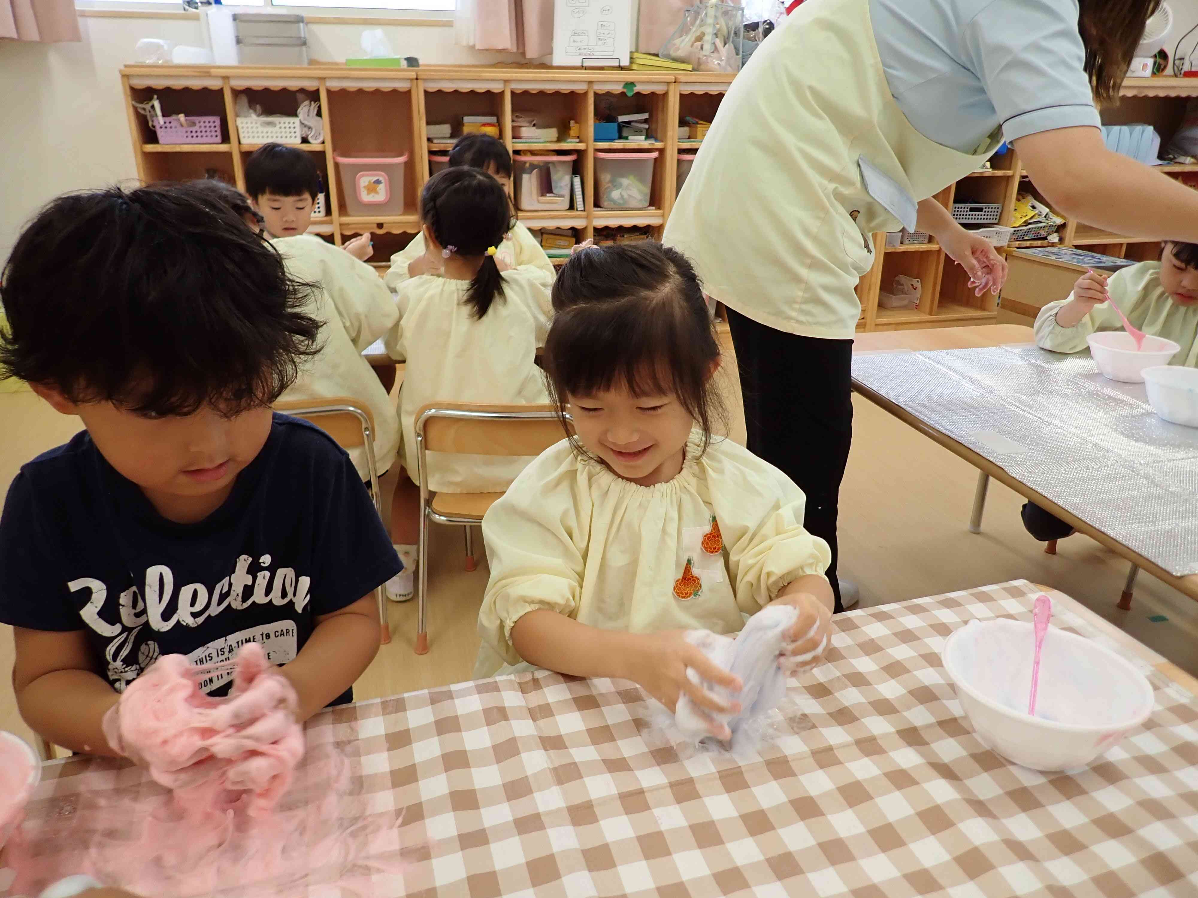 ハンドソープのふわふわ感に「え~めちゃふわふわやのに固まるの?!」と半信半疑のきりん組です(笑)