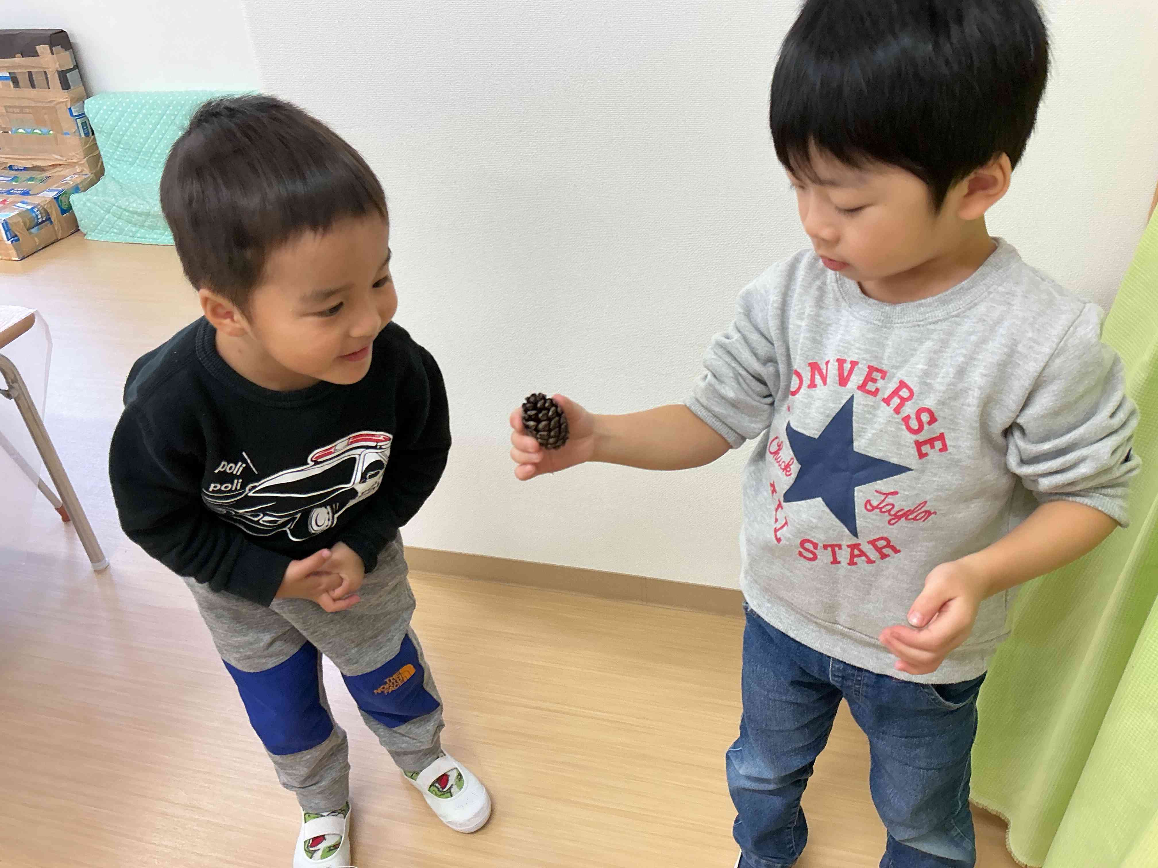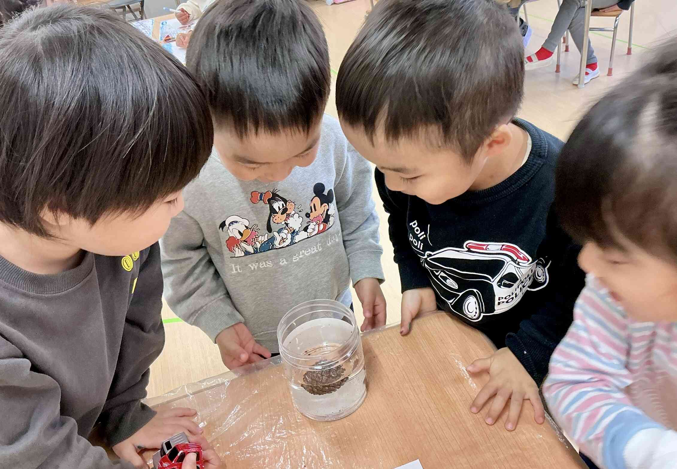 水で浸すと松ぼっくりが小さく萎んでしまい子どもたちは、「なんで小くなったの」