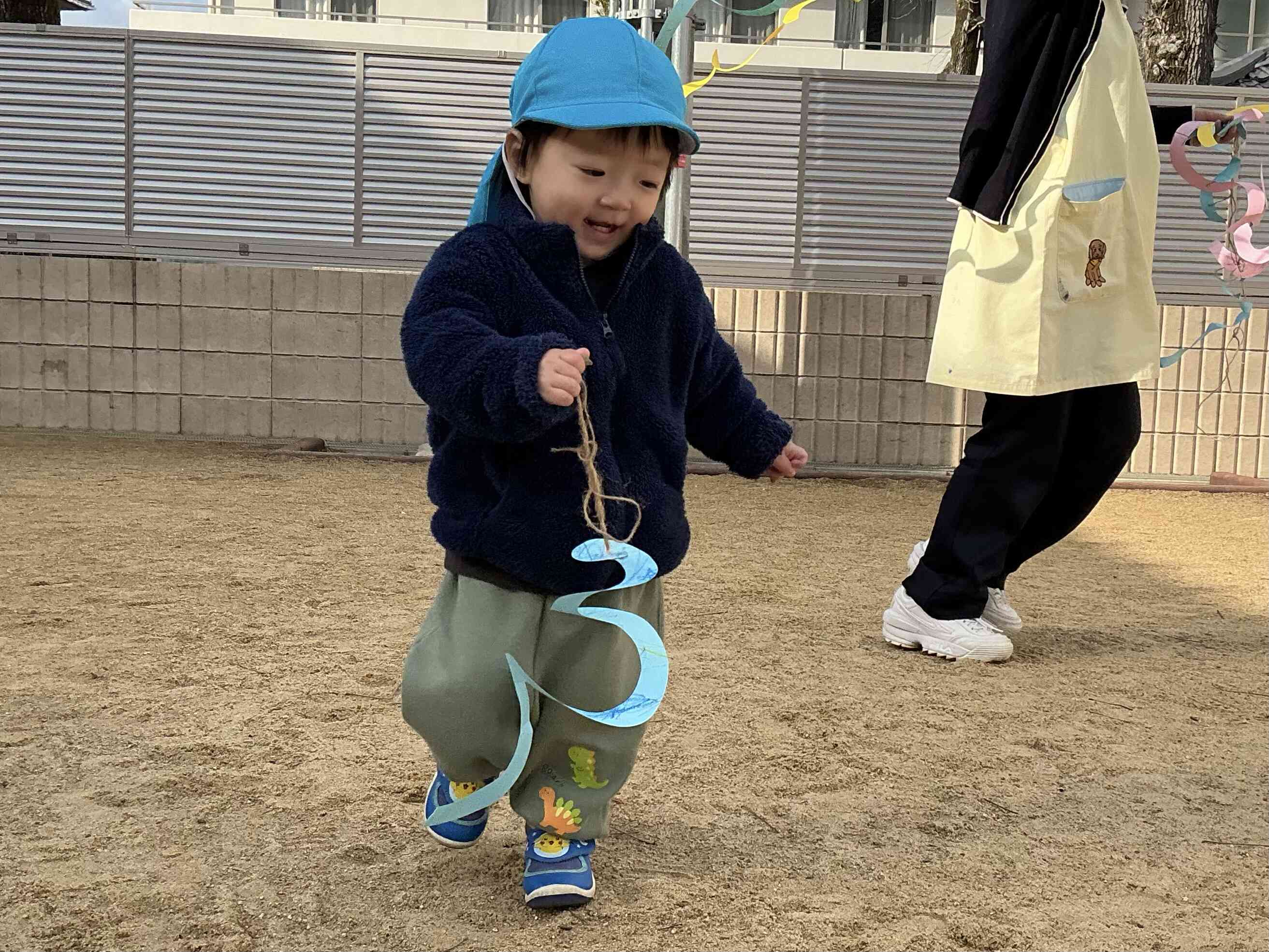 保育者が凧を引っ張るのを追いかけて遊びました。