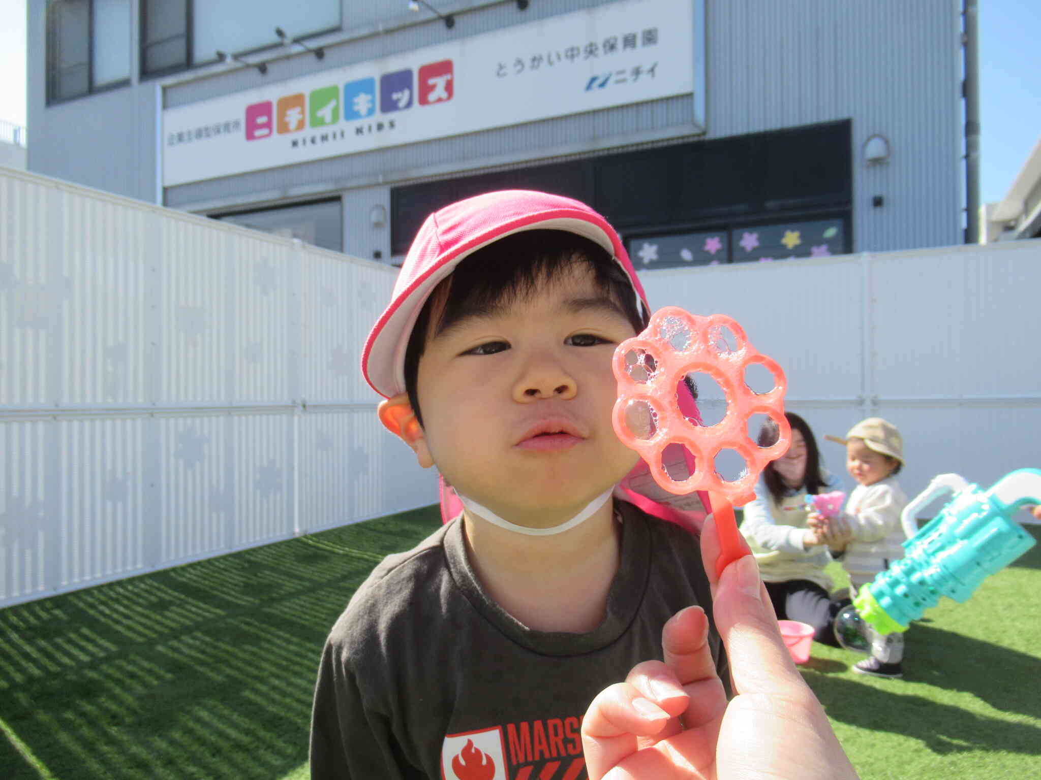 風に揺れるしゃぼん玉をじっと見つめたり、手を伸ばして触れようとしたりと、やさしい時間を過ごしました。キラキラとした動きに目を輝かせながら、心地よい外あそびを楽しんでいます。