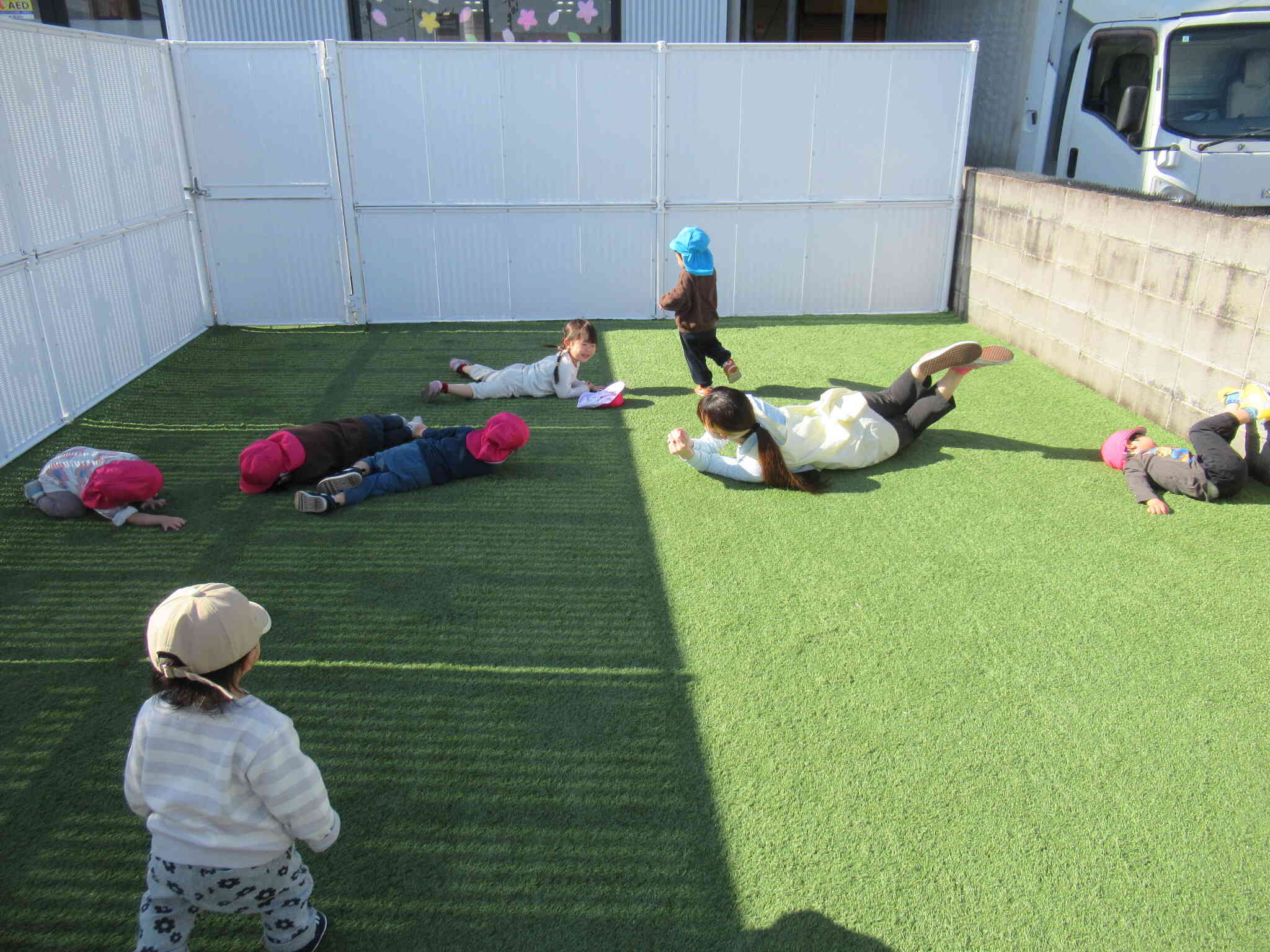 あたたかい日差しの中、園庭でごろごろとひなたぼっこを楽しみました。空を見上げたり、のんびりと寝転んだりしながら、心地よい時間を過ごす子どもたち。穏やかなひとときに、自然と笑顔が広がっていました。