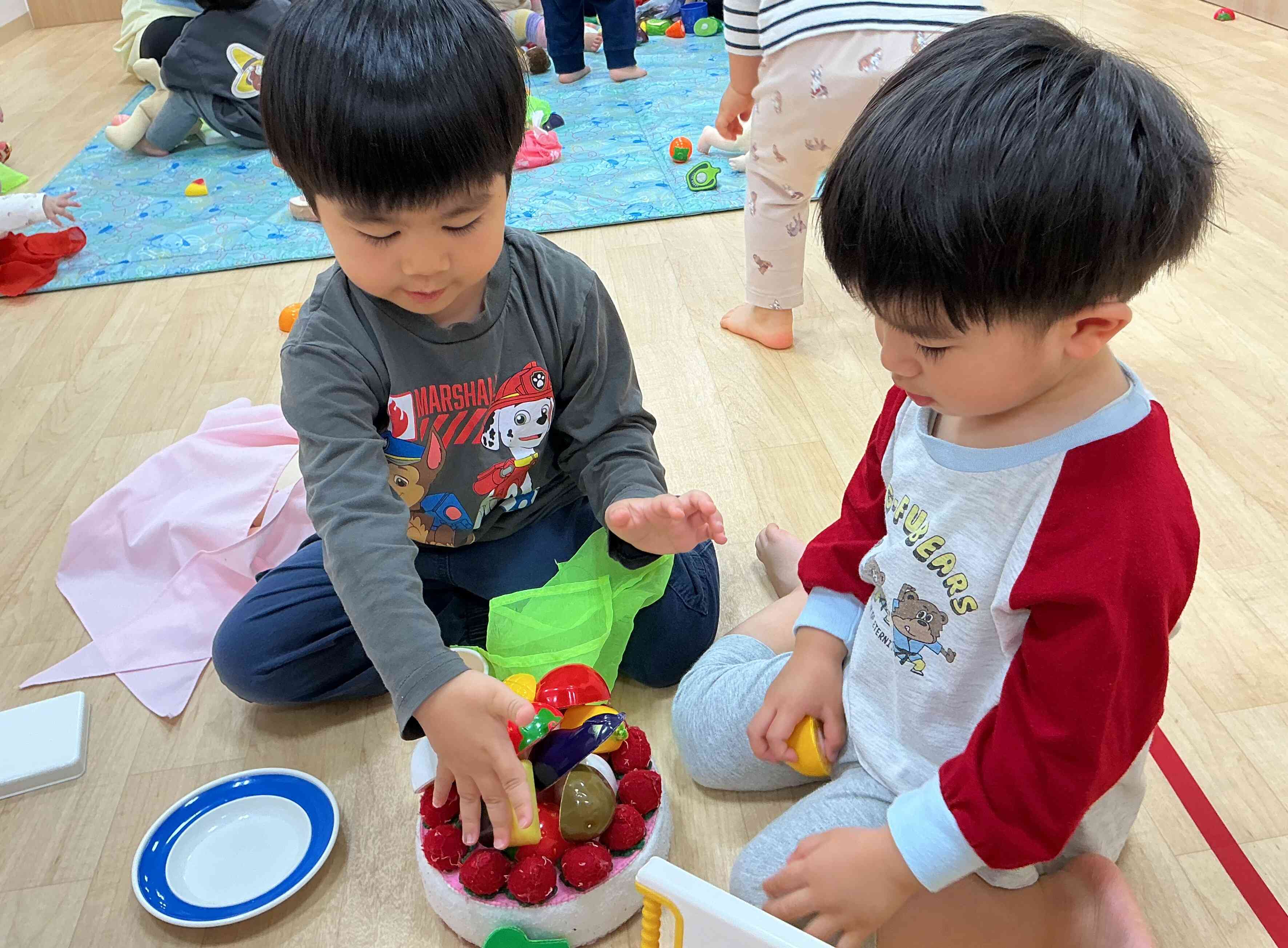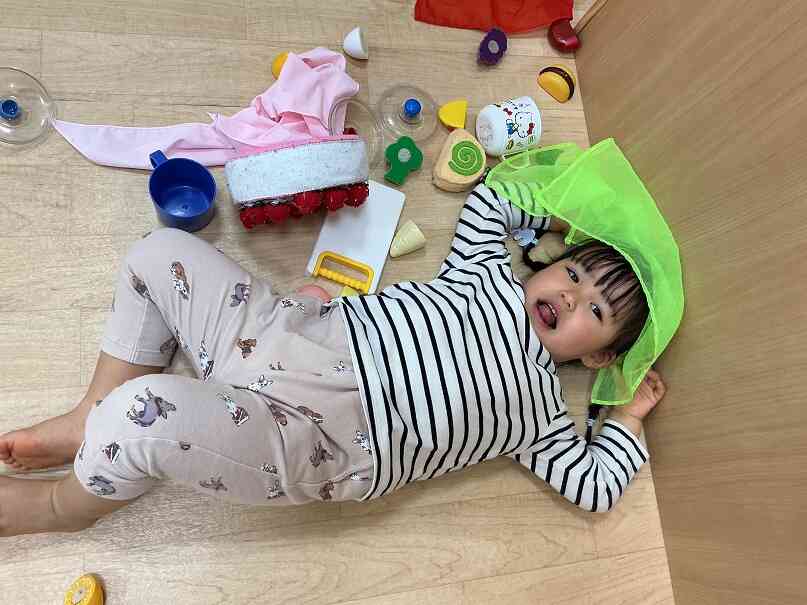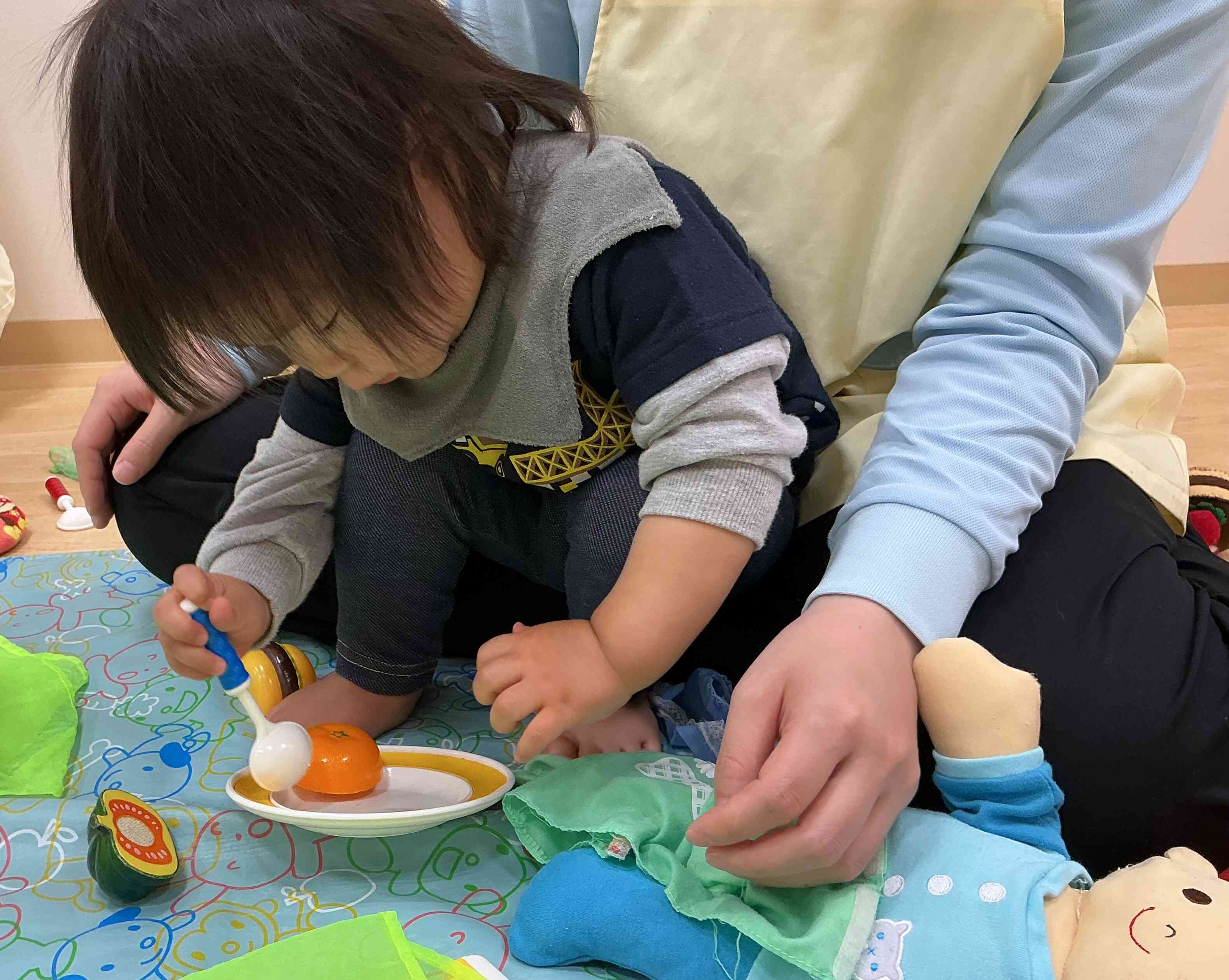 スプーンで食べる真似をしたり、コップで飲む真似をしたりして楽しそうに遊んでいました。