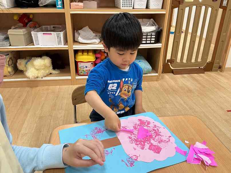 さくらの花に見立ててちぎった折り紙も上手に貼っていました。