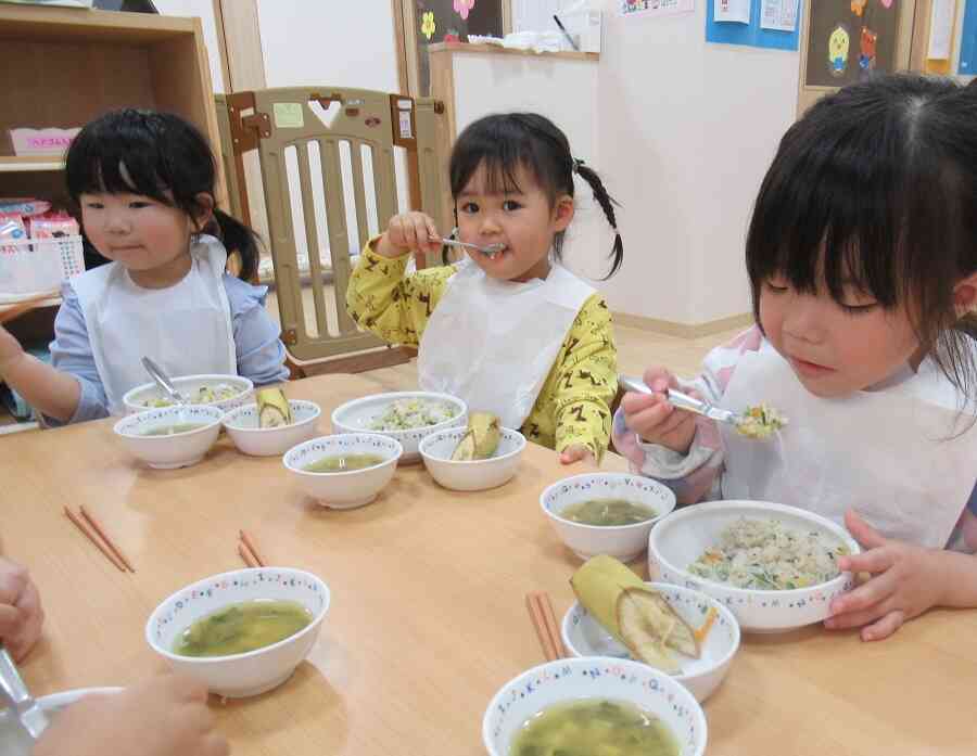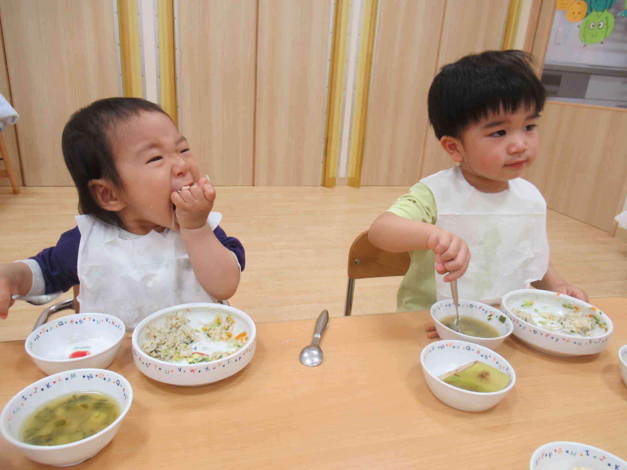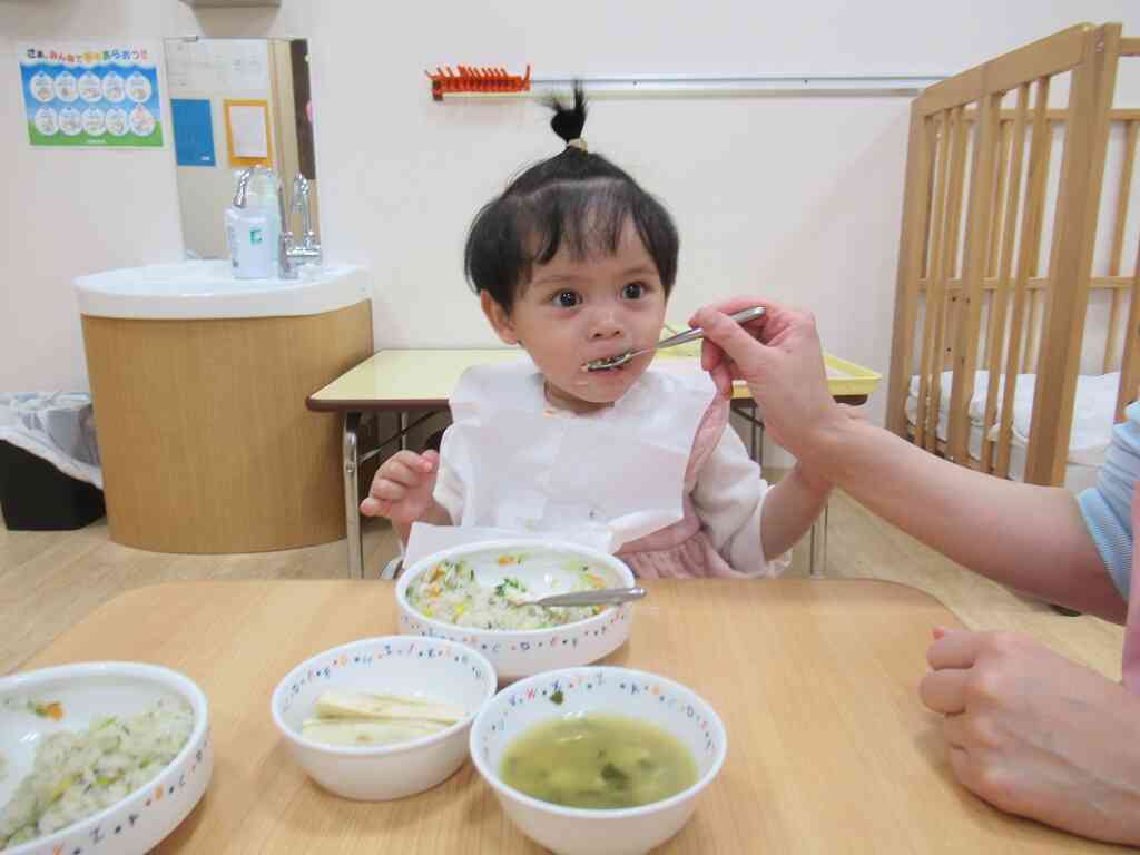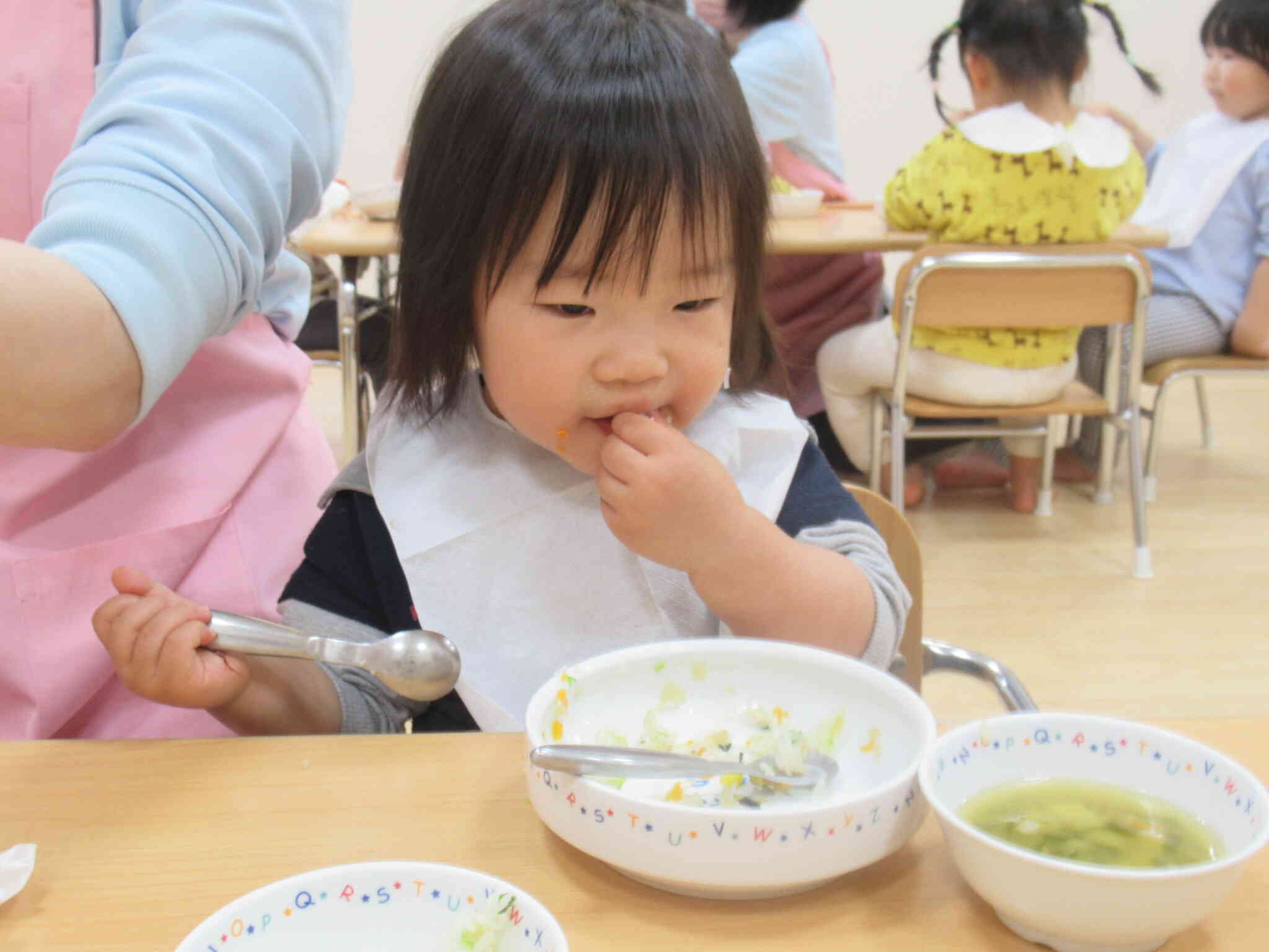 新しく入ってきたおともだちも少しずつ保育園の給食にも慣れてきました。