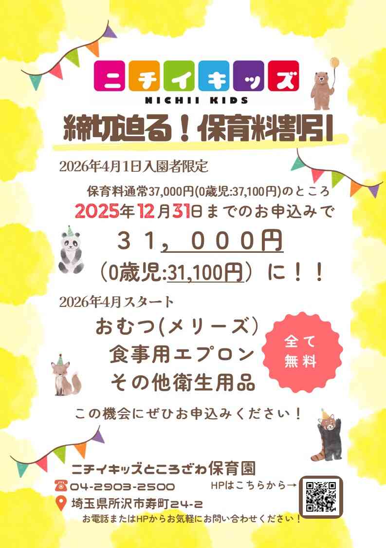 保育料の早期割引:2025年12月31日までに継続決定・専願(2026年4月1日入園)での申込の提出となります。