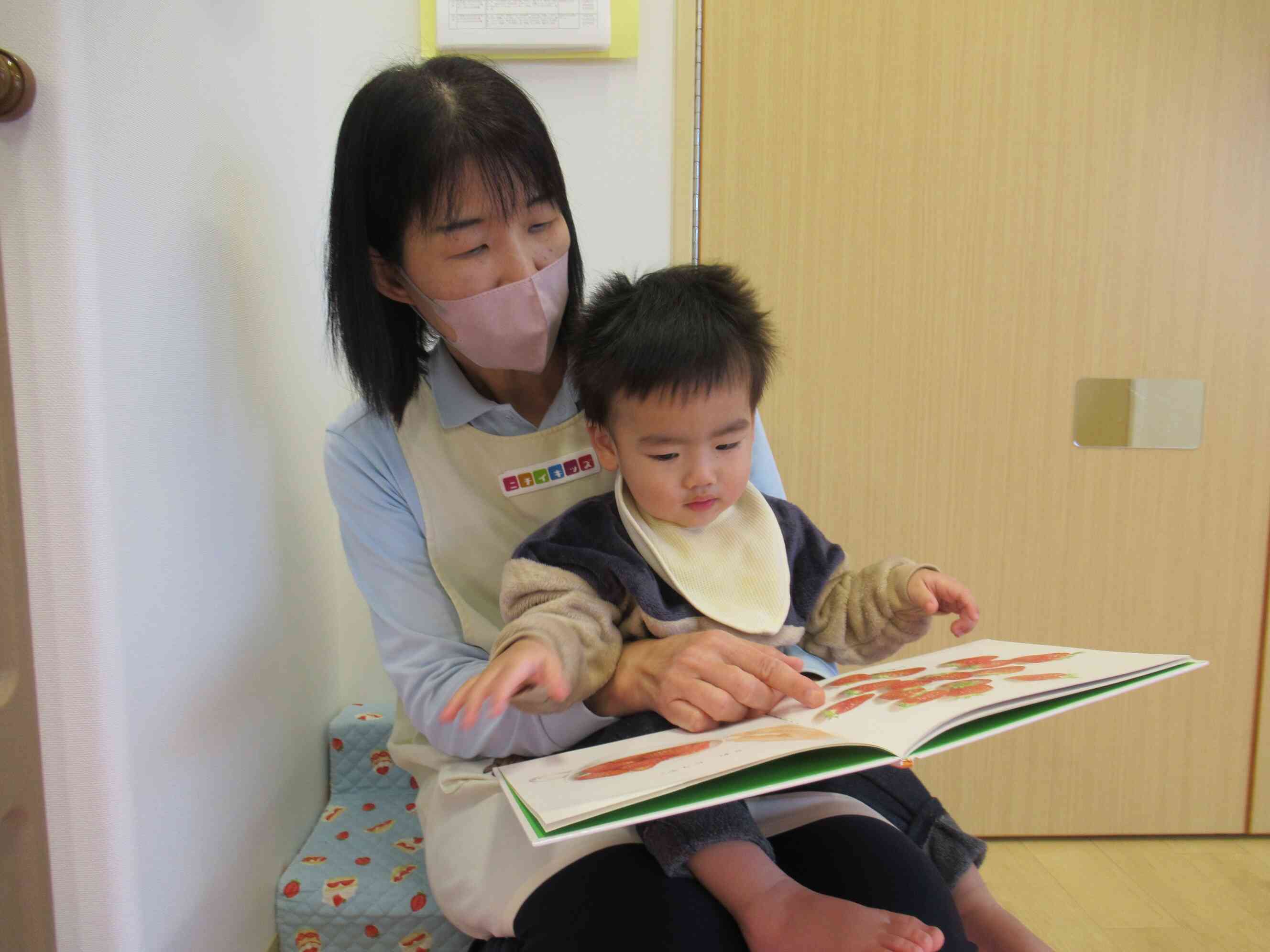 言葉が増えてきたMちゃん、好きな絵本を「よんで!」と持ってきました。おやつ後の自由時間にゆったりと見ます。今日は『くだもの』の絵本です。「はい、どうぞ!」食べる真似をして、おいしいね~とにっこり笑顔を見せてくれました。