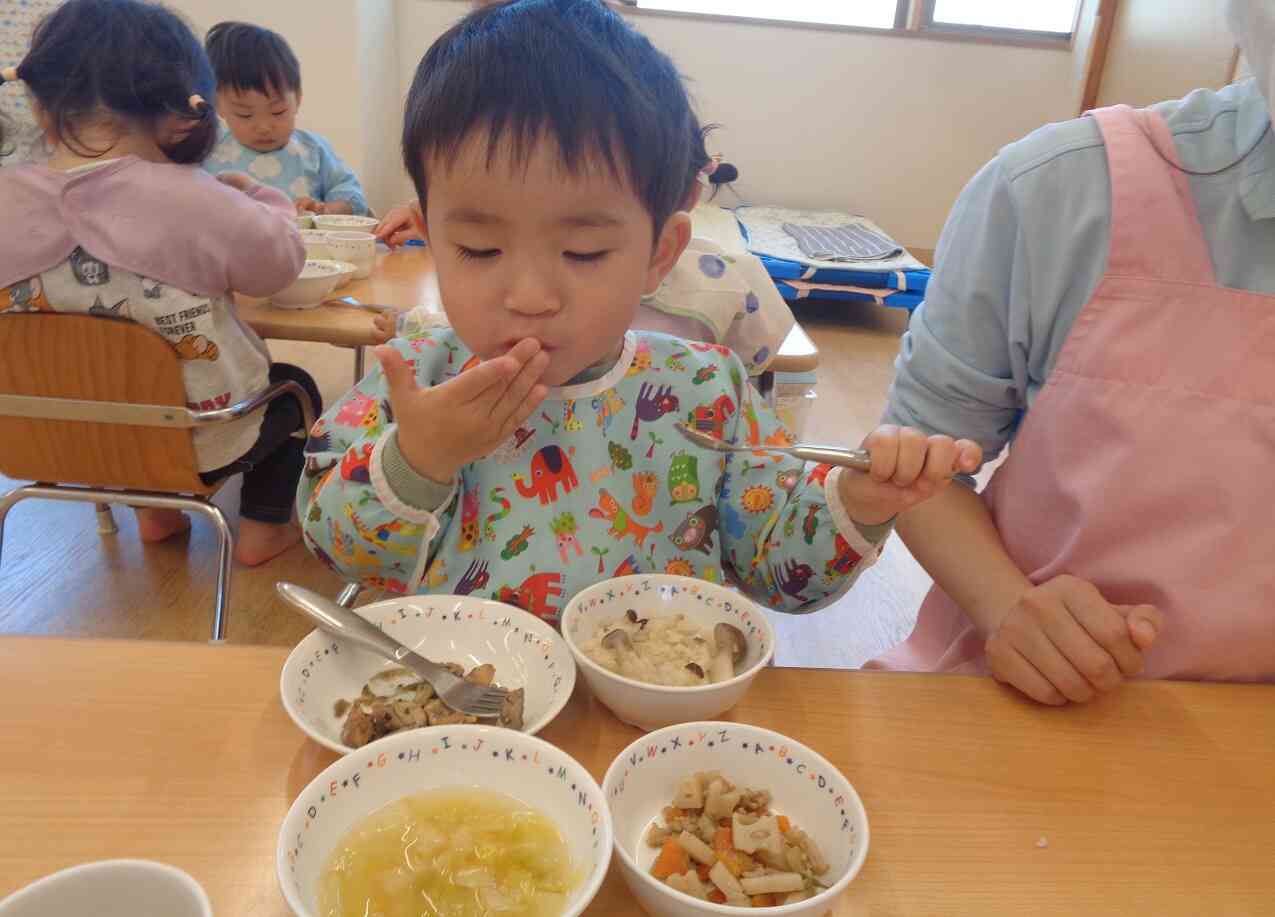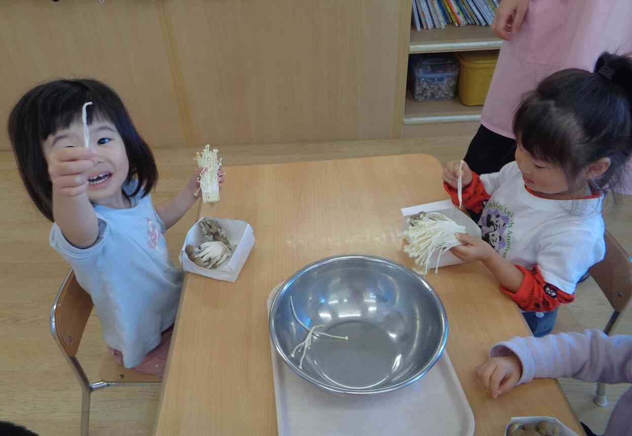 “これは何かわかるかな?”の問いかけに「きのこ!!」と元気に答えるお友達がたくさんいました♪