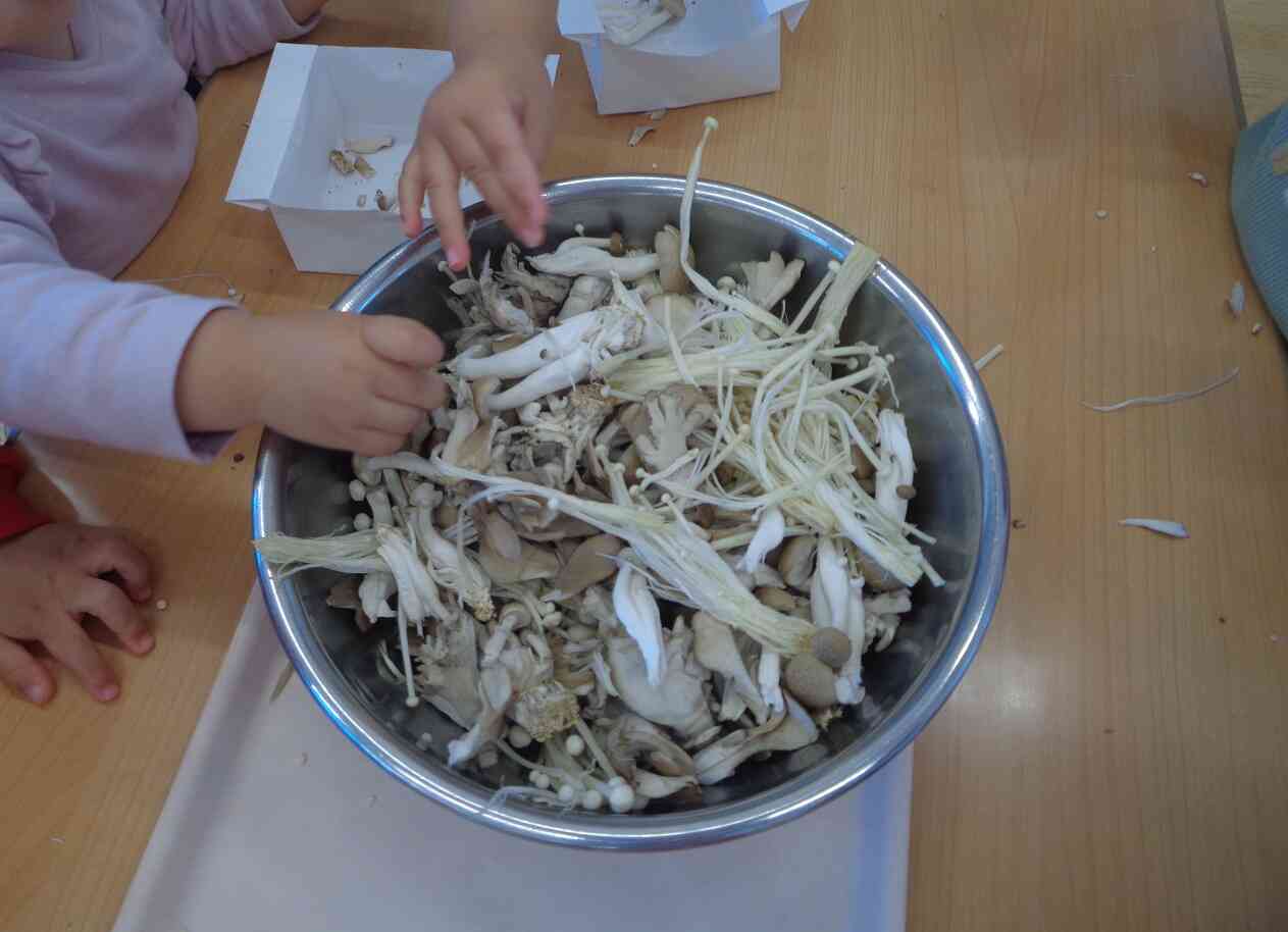 実際に割いたきのこは食べられませんが、給食のお手伝いということで活動が行われていました!!