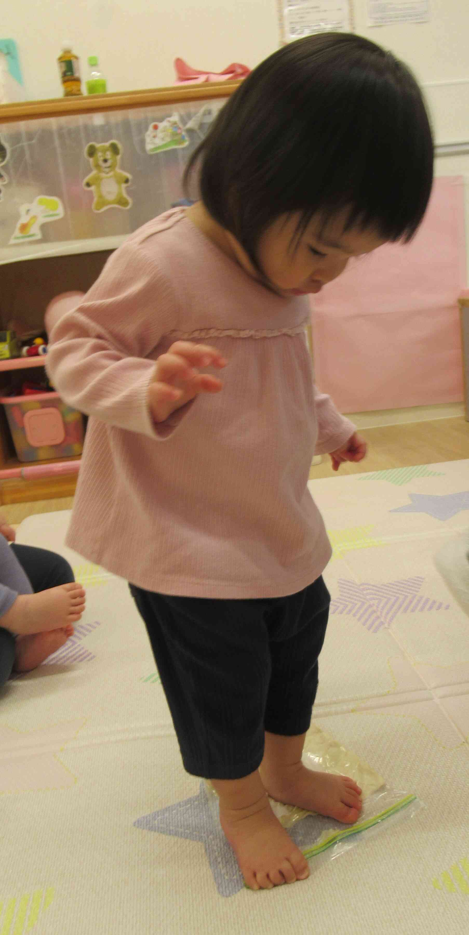 お友だちの姿に気付き、すぐに生地の上に立っていたお友だち。足を動かすと沈む生地の感触ににっこり!「へへっ♪」と笑っては何度もふみふみし、楽しんでいました☆