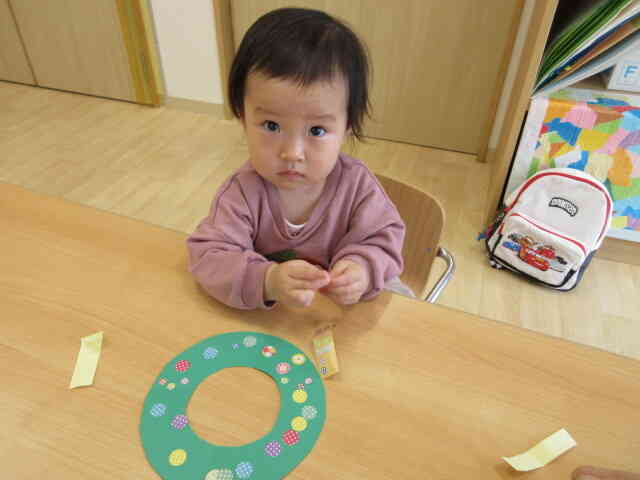 あひる組(1歳児)さんは、カラフルなシールを貼って、