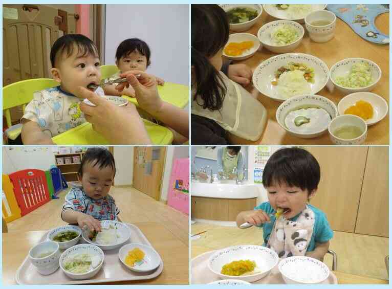 0歳児のお子様は中期食からの提供です。成長に合わせて、おうちの方と相談しながら大きさや柔らかさを変えています。保育士だけでなく、栄養士も子どもたちの食べ具合を毎日確認しています☆