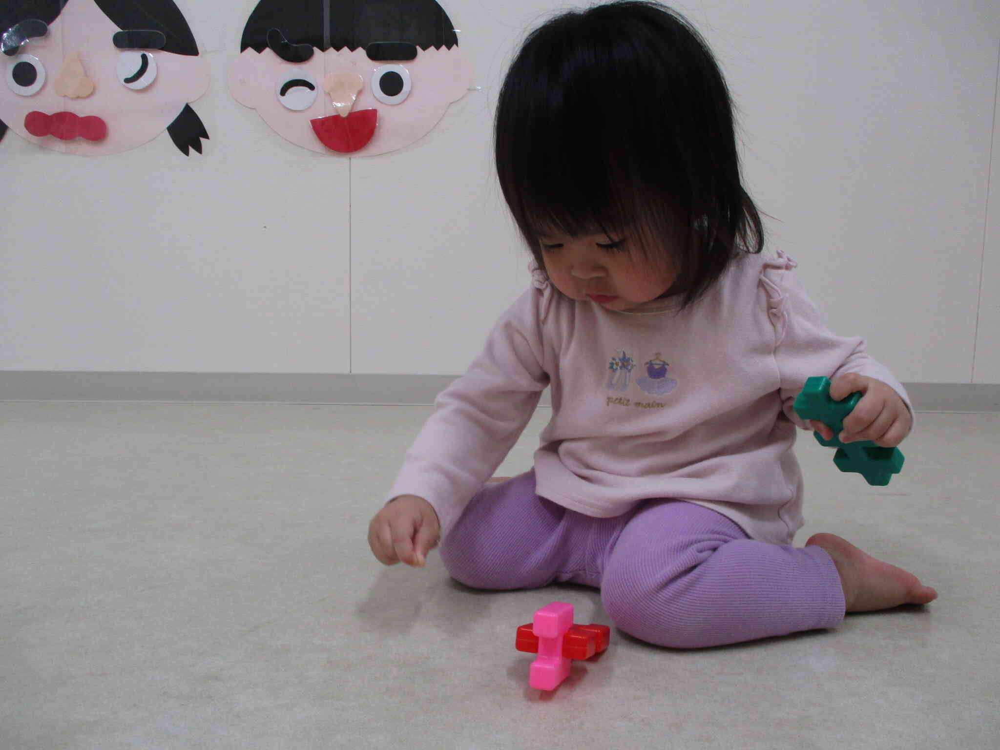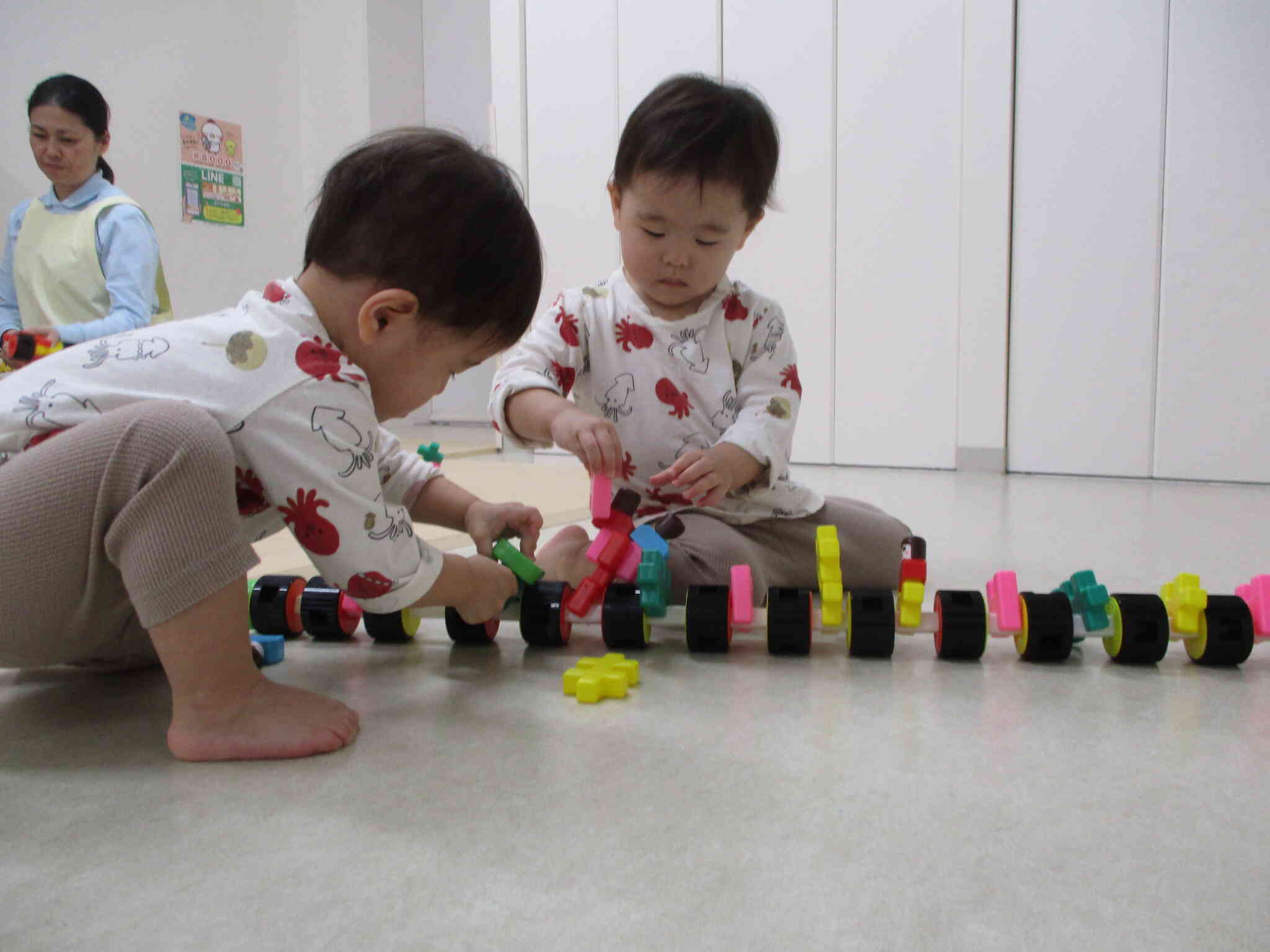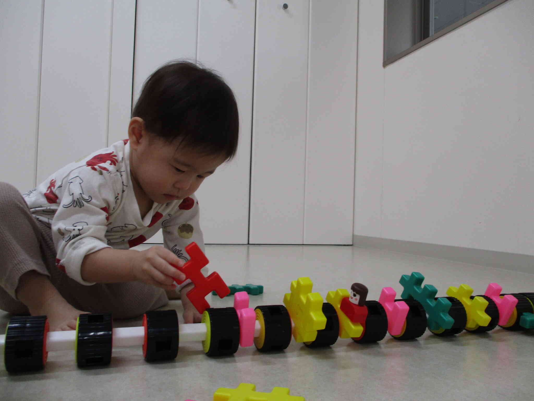 「○○つくりたい」と仕草や片言で伝えたり、自分でつくりたいものをイメージしながら組み合わせたりして楽しんでいます。