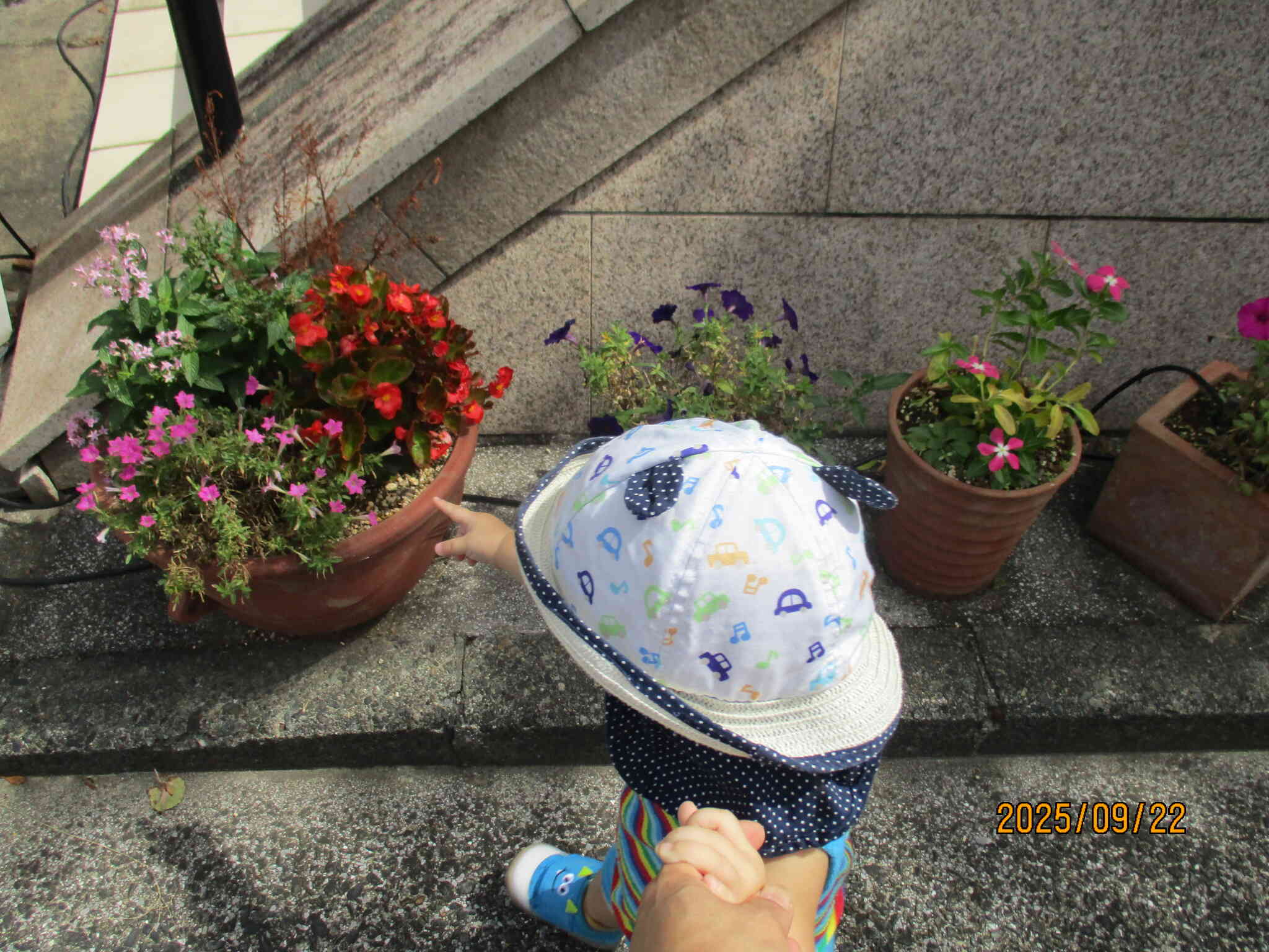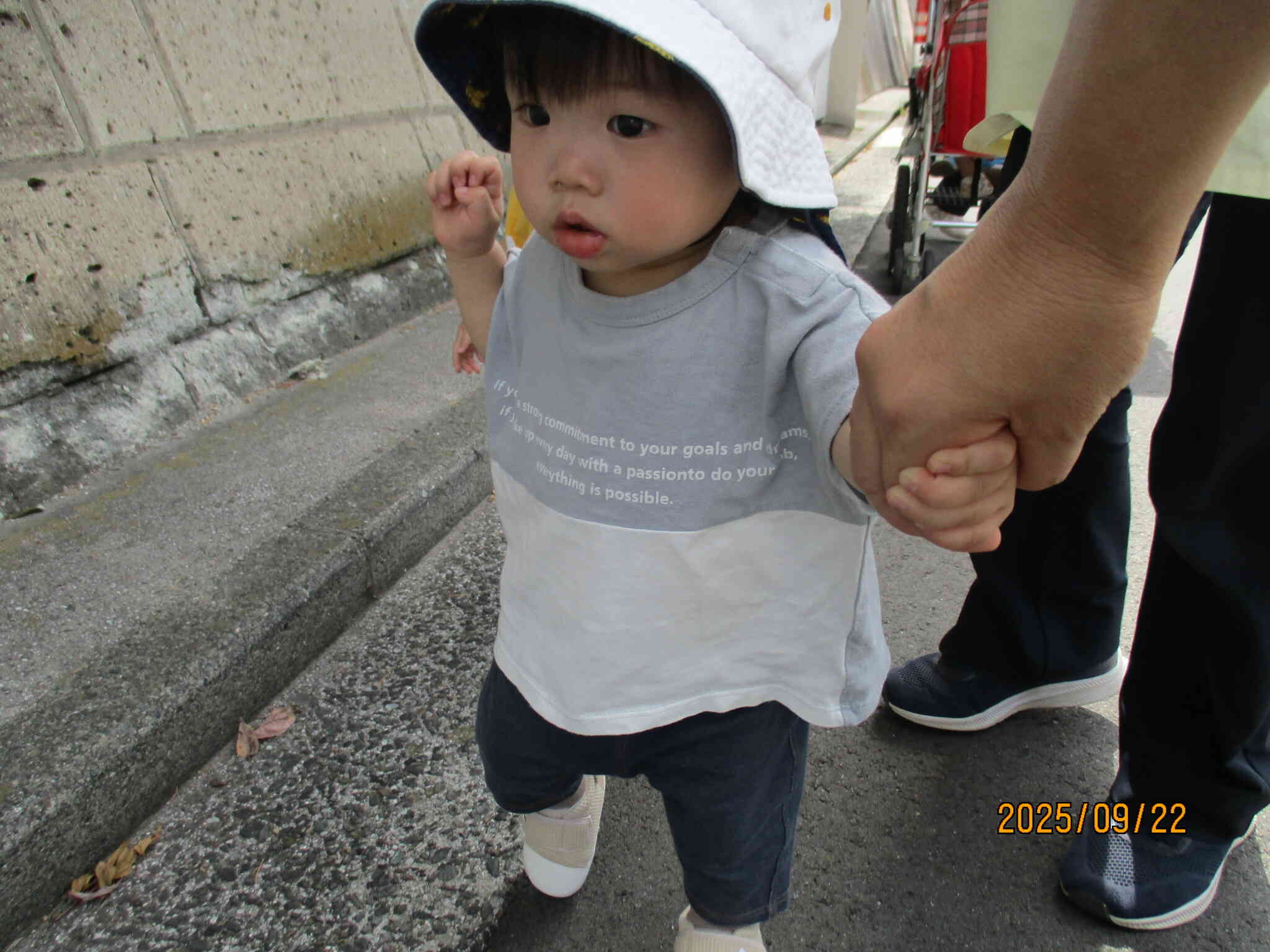 自分の足で歩くのは特別で、お花を見たり排水溝をのぞいたり楽しんで歩いていました♪