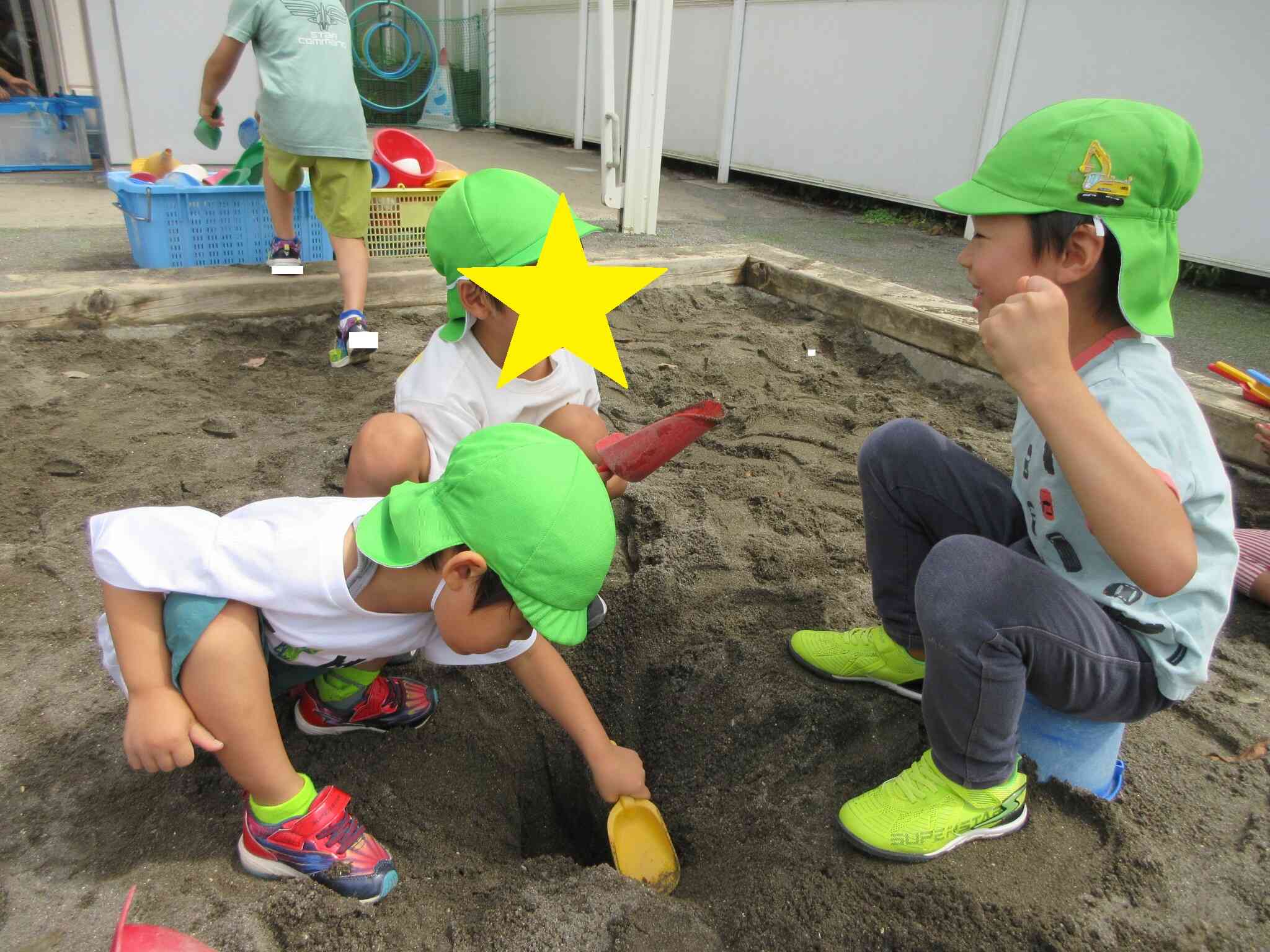砂場で遊んでいる子どもたち。何やらこそこそと話しているのでそ~っときいてみると、「砂場に穴を掘っていたらどこまであるのかな?」「やってみる?」と砂場の底を気にしている様子でした!