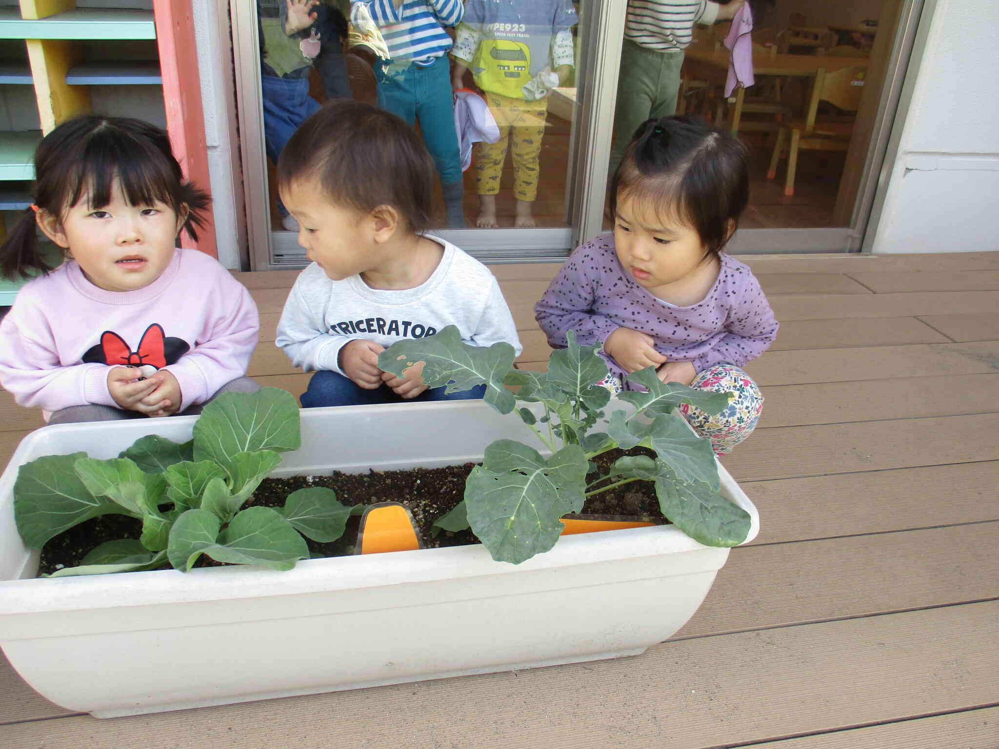 先日、うさぎ組では、キャベツとブロッコリーの苗をプランターに植えました!