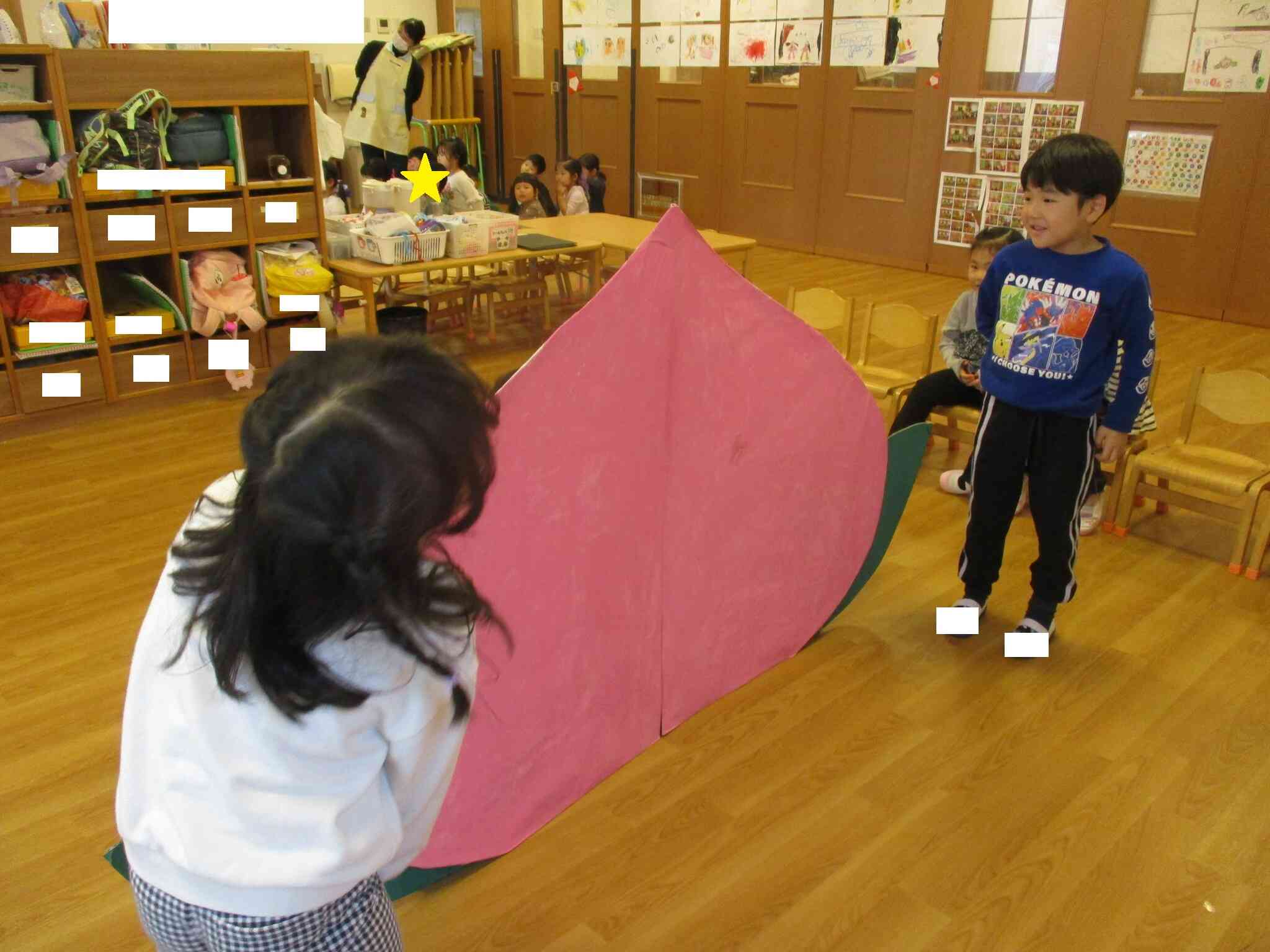 発表会で使用した大きな桃を使って桃太郎ごっこをしました!実際に演じた役とは違う役にも挑戦!新しい感覚で楽しかった様子です♪