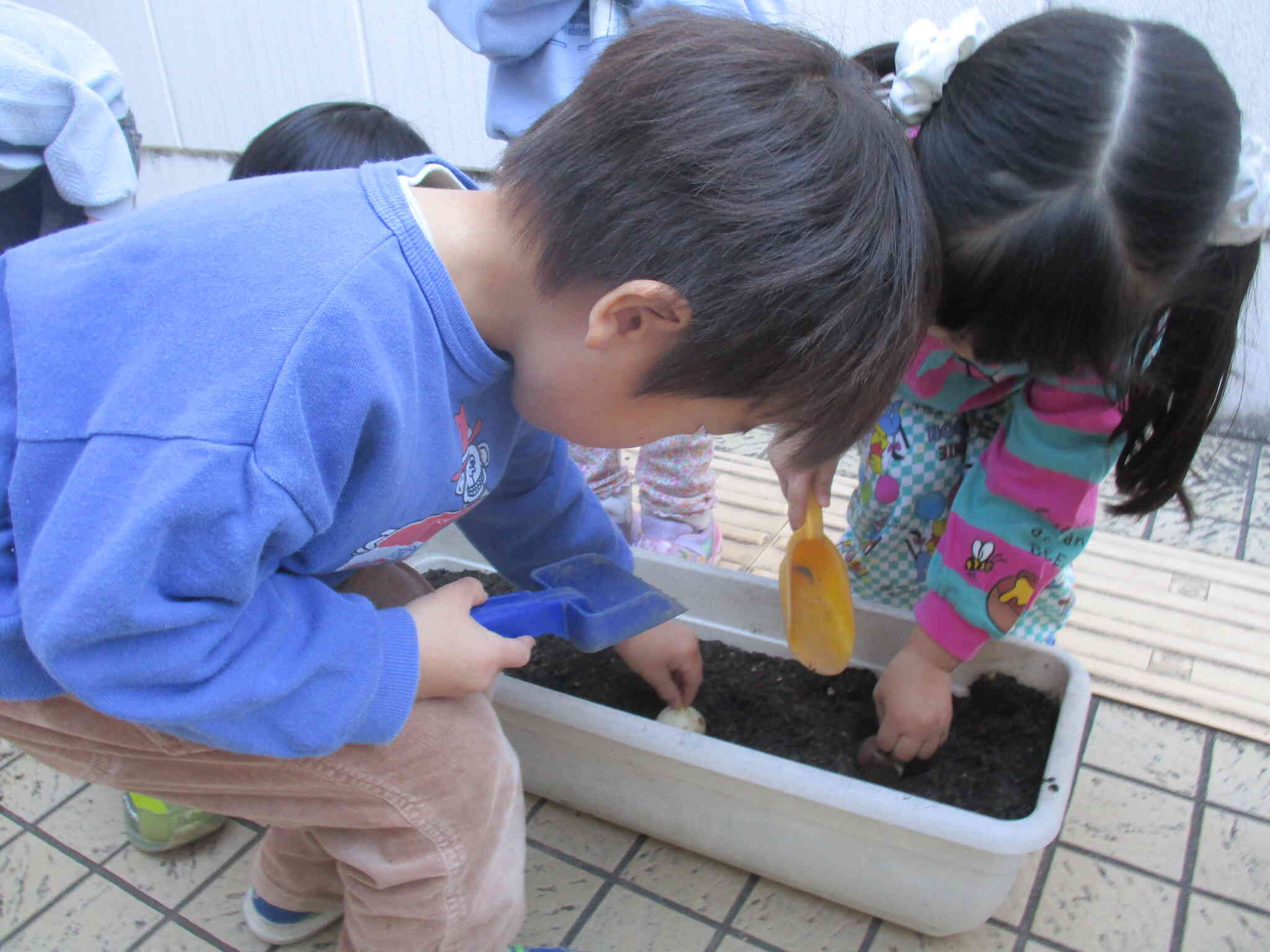何色のチューリップが咲くかを予想して塗り絵をし、自分が植えたところに差し込みました♪