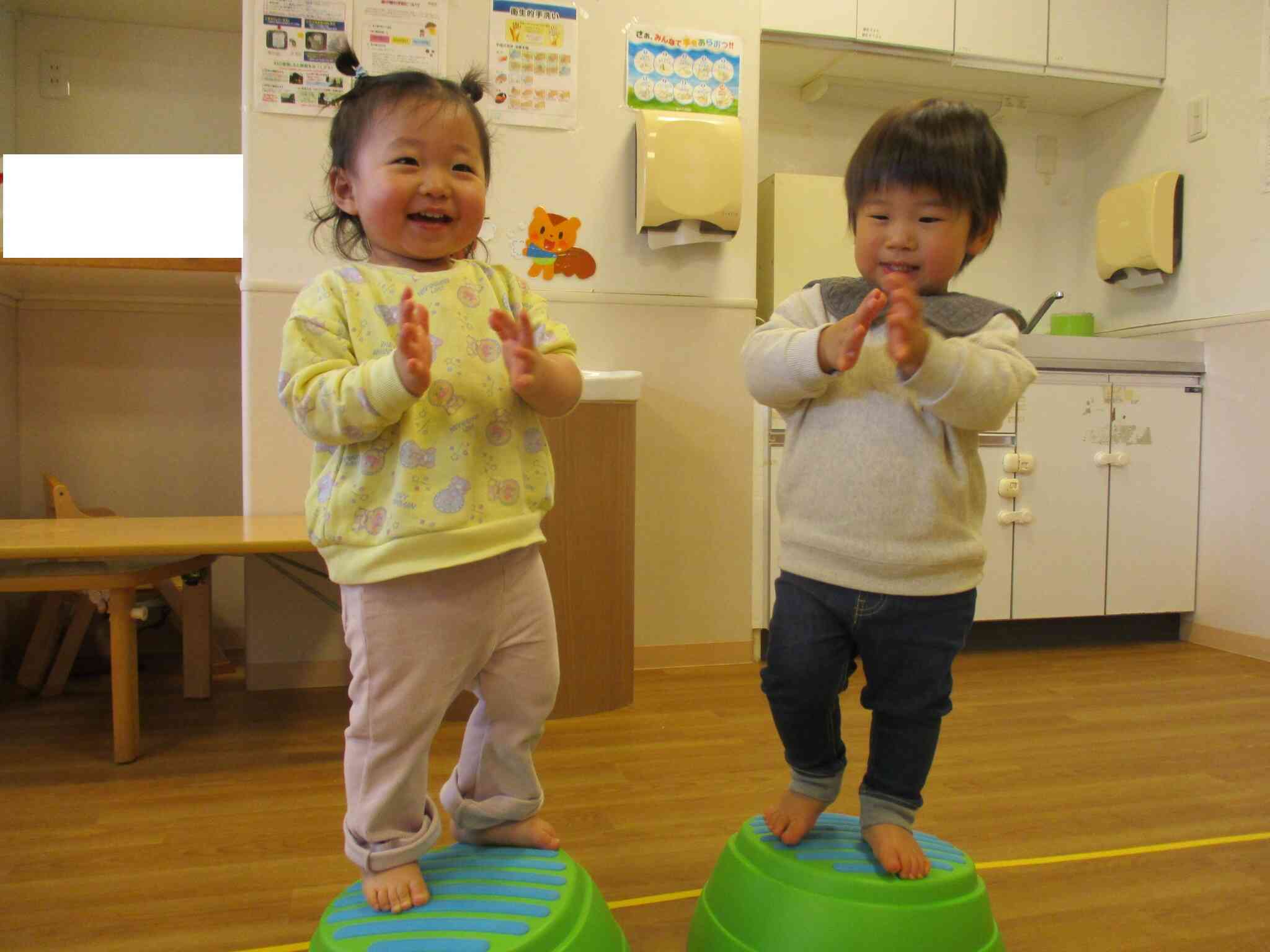長い一本橋に座ったり、歩いたり、台の上に立ったり、中に入ったり…