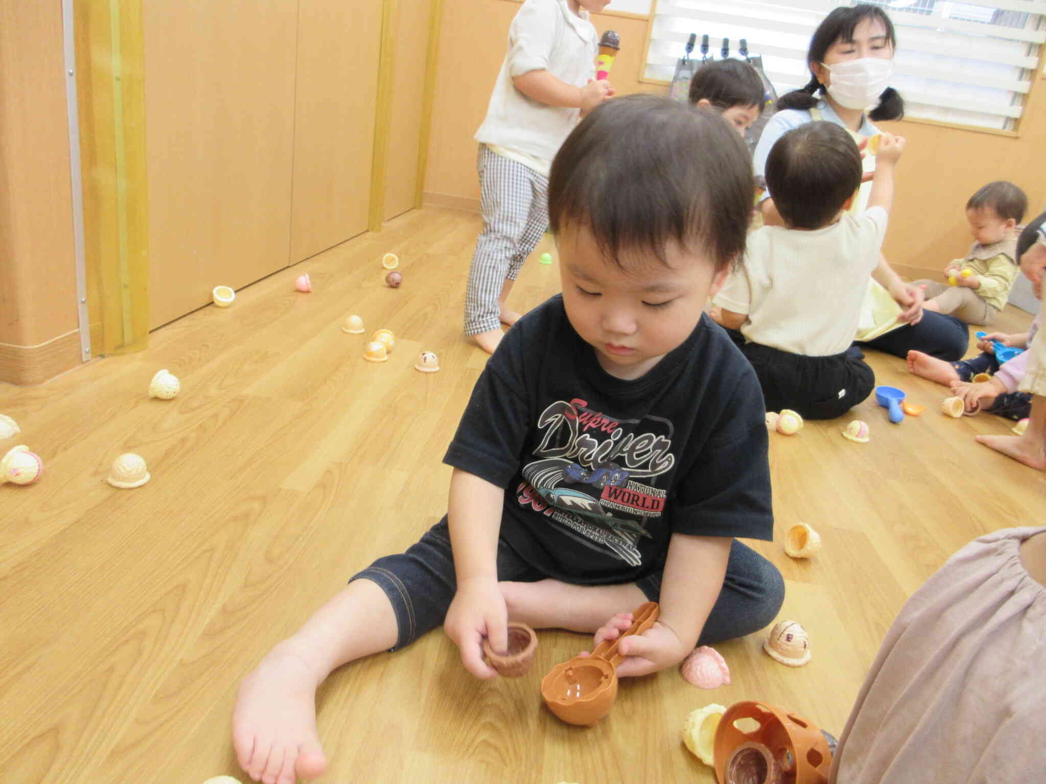 気分転換に、他のクラスからおもちゃを借りて楽しみました。