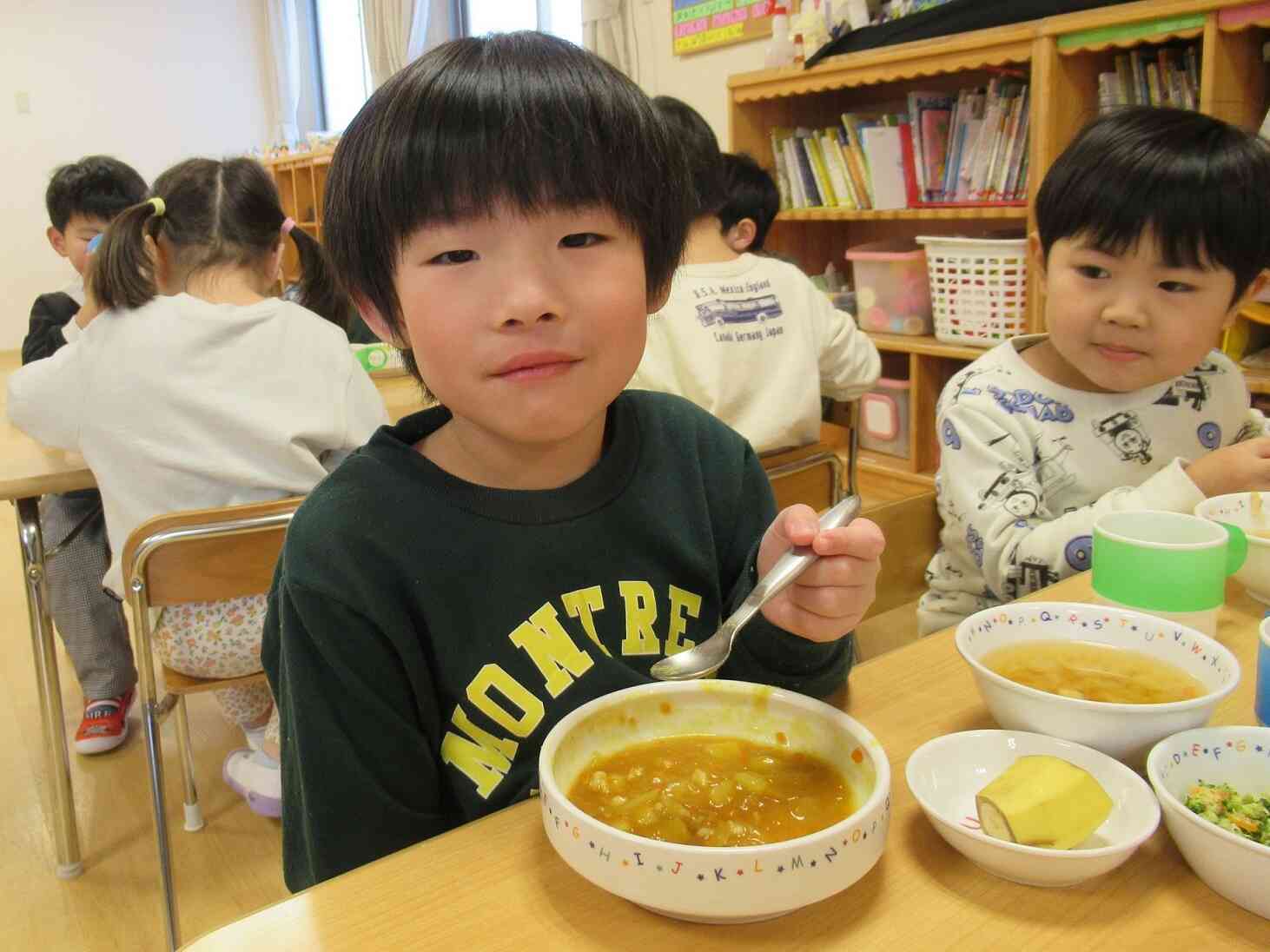 「ハートのカレー、かわいい」、「お野菜おいしい!」とお話しながら食べていました。
