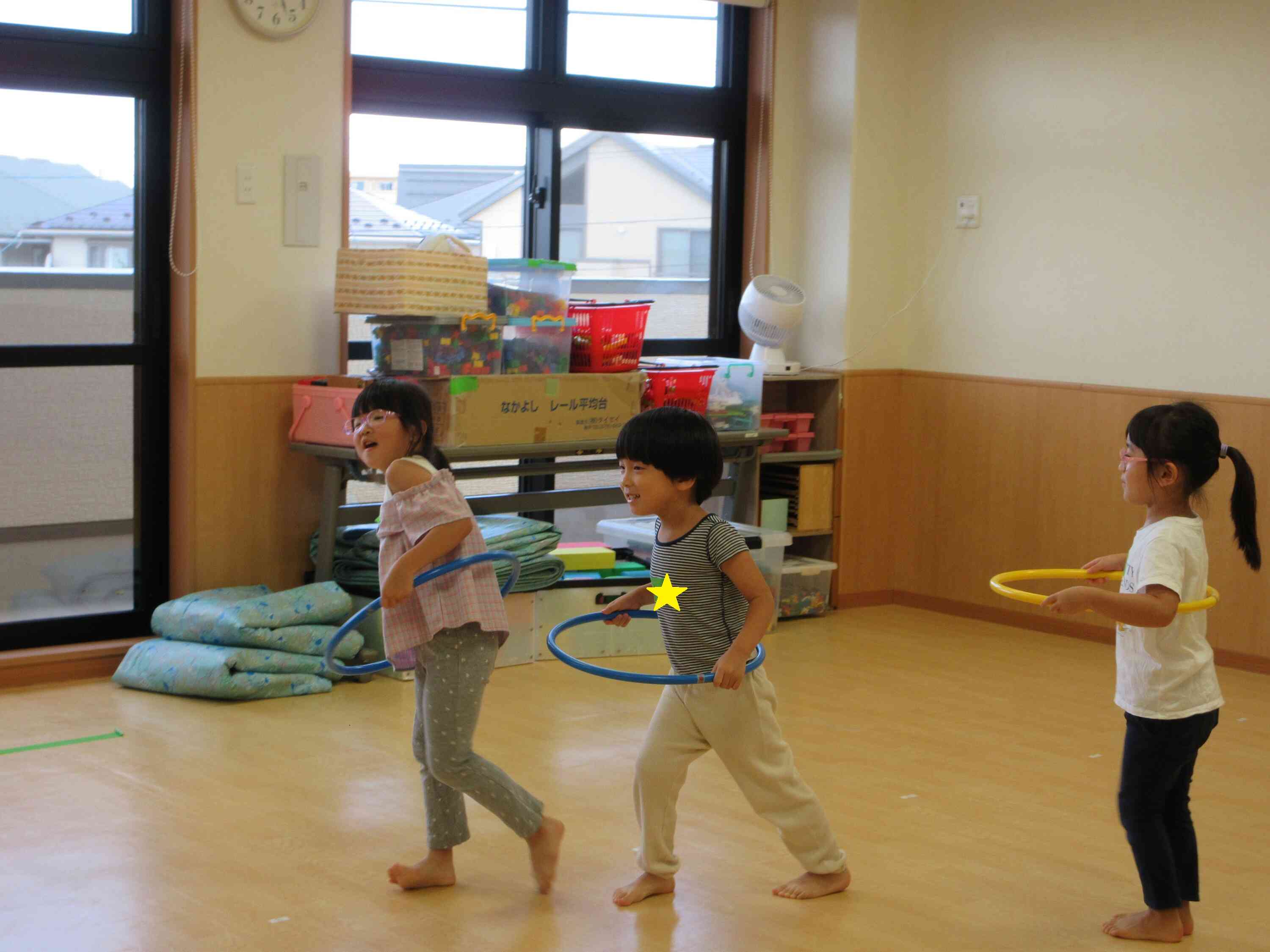 フラフープの中に入ってお散歩したり、フラフープをハンドルに見立ててバスごっこをしたり、音楽に合わせてノリノリです!!