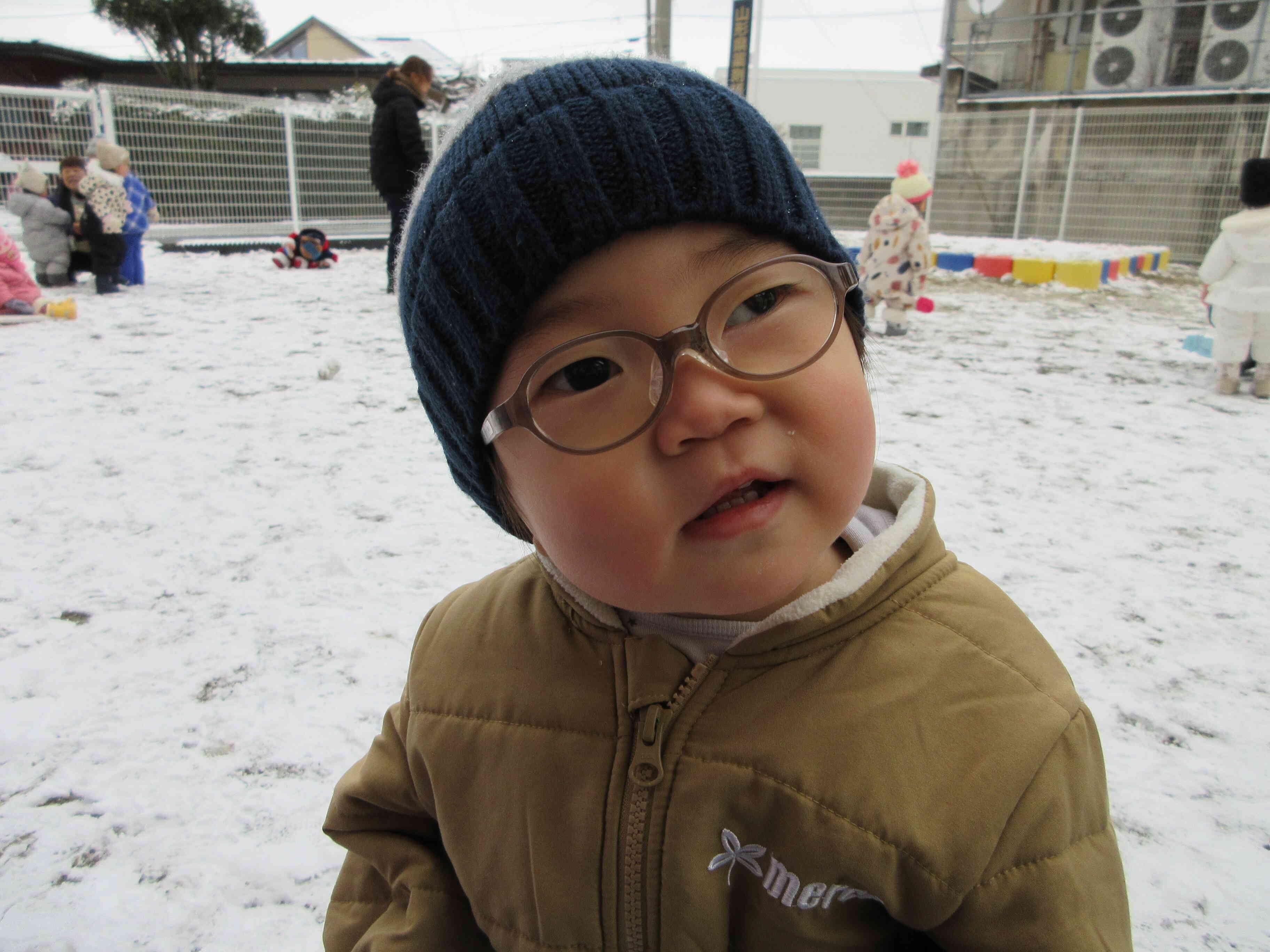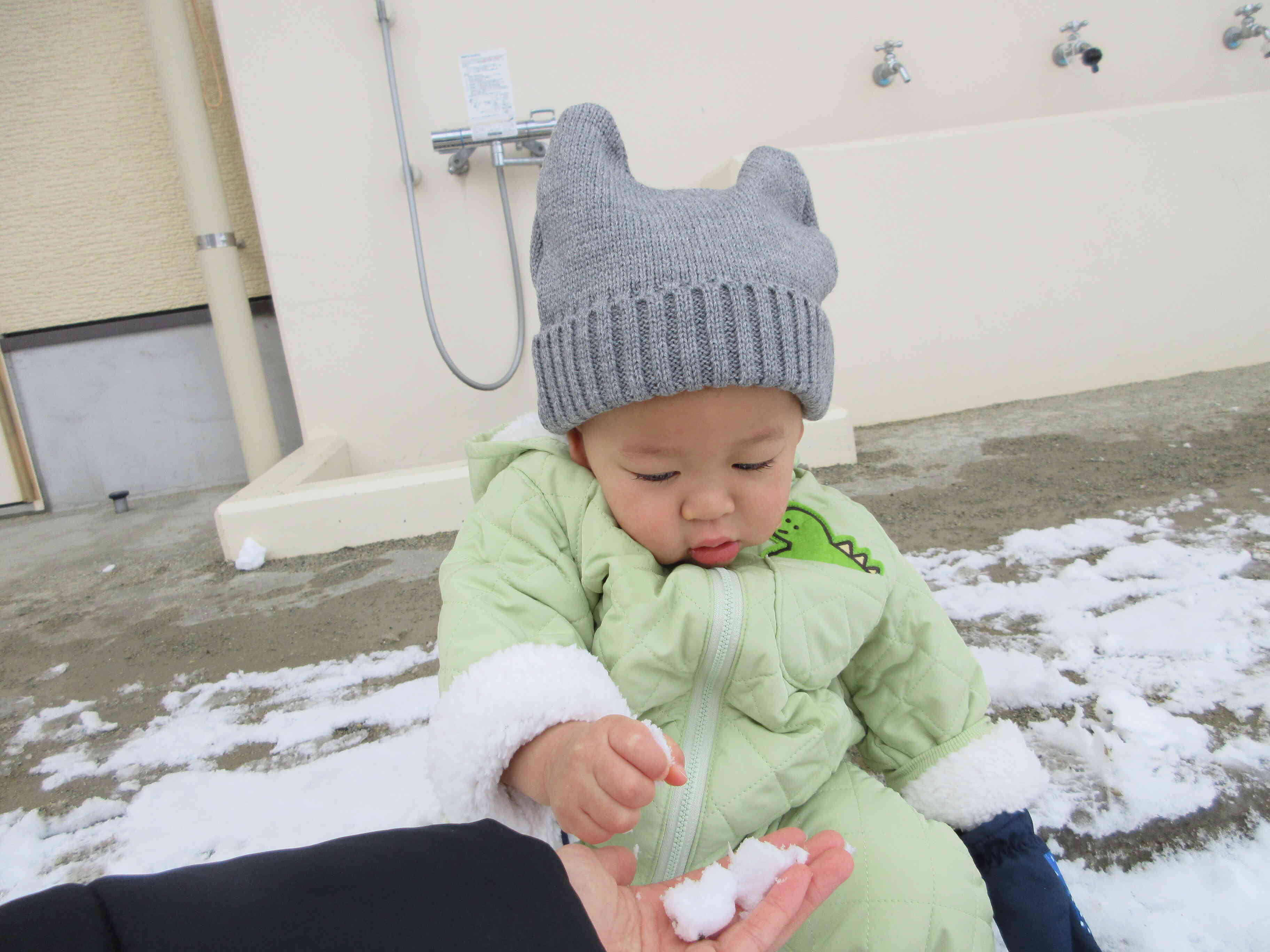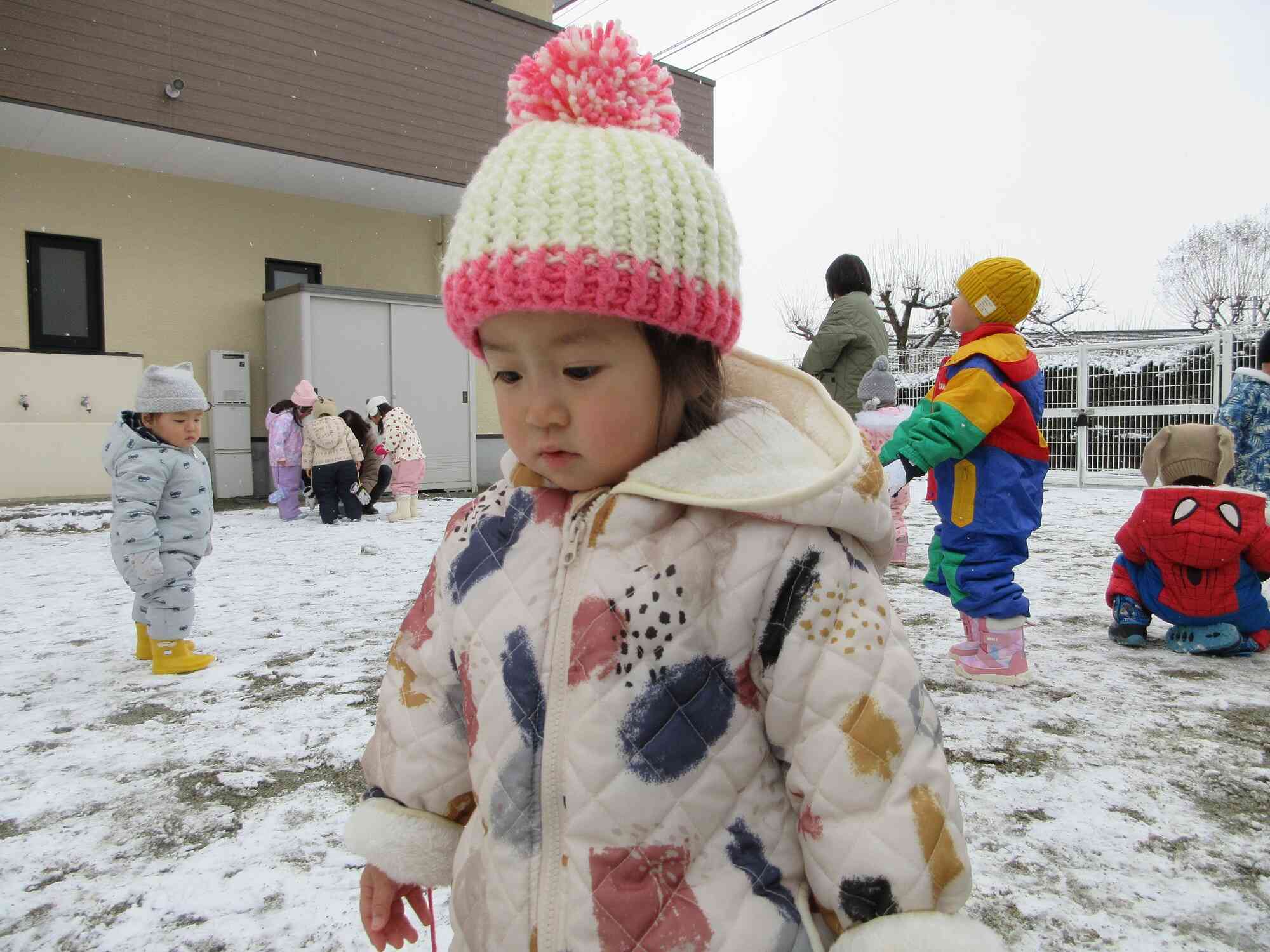 今日はスノーウェアを着て、園庭で雪遊びをしました!初めての戸外での雪遊びに、ちょっぴりドキドキしているひよこ組さんでしたが、雪には興味津々な様子でしたよ♪