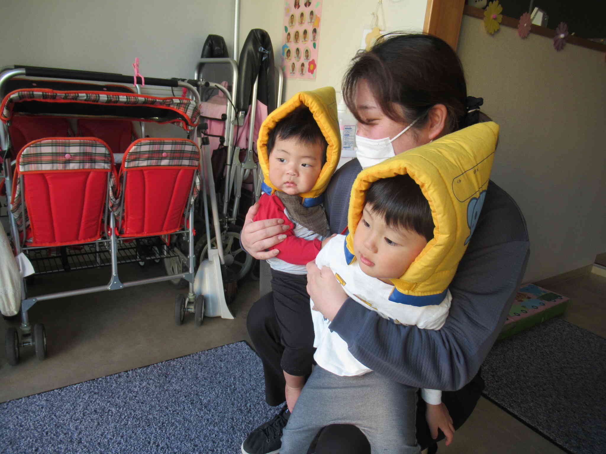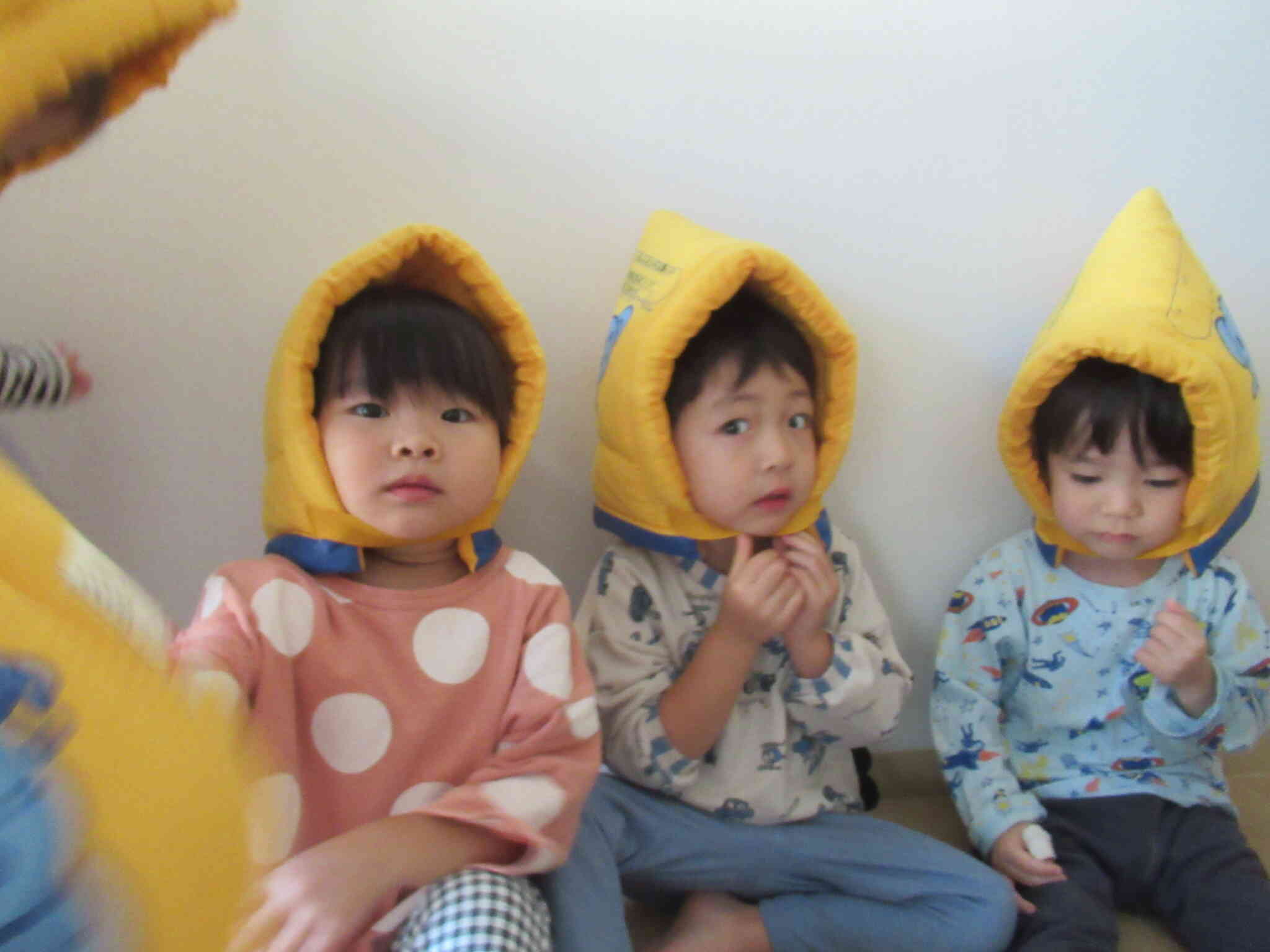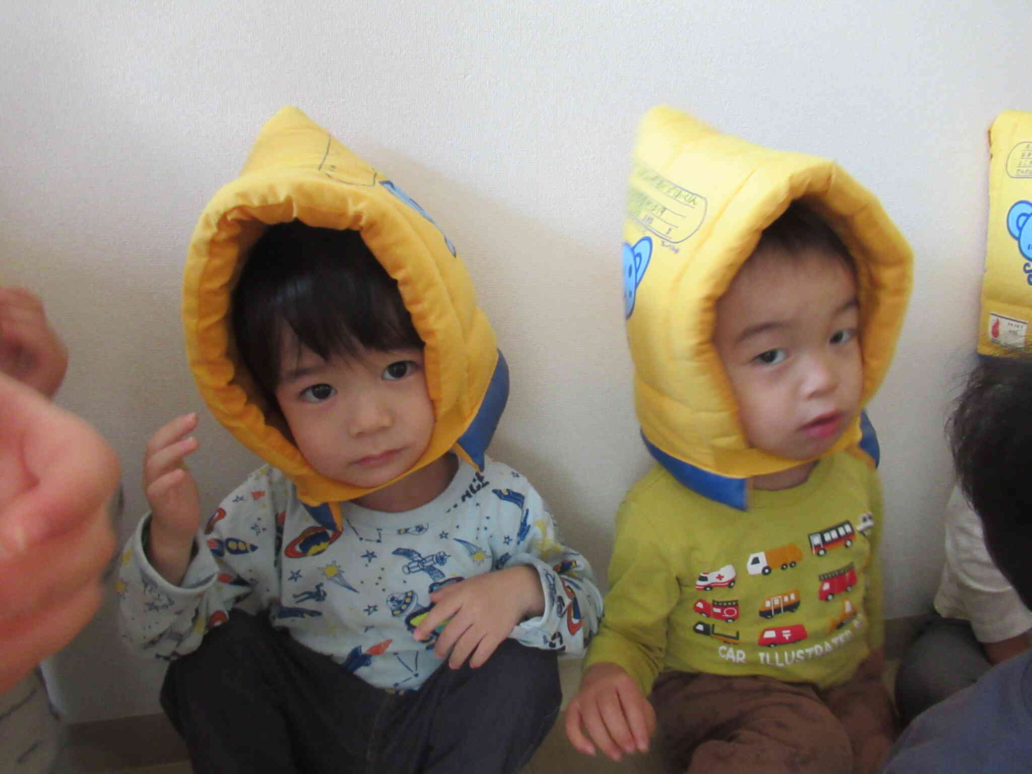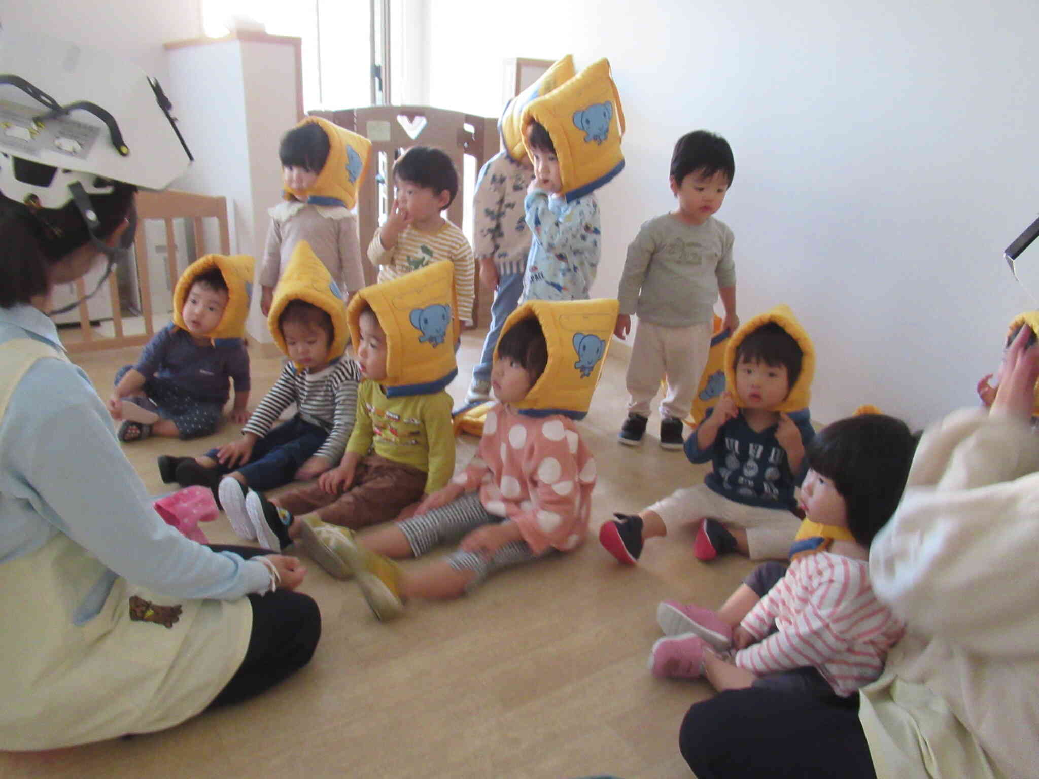 震度6を想定した引き渡し訓練を行いました!想定で、余震の中、保護者のお迎えを待つという訓練です。先生のお話をよく聞いて静かに避難することができました!日頃の訓練の成果もあり防災頭巾を嫌がることなく被ります。暗くなるにつれ子ども達が不安にならないように絵本の読みきかせや手遊びなどをして楽しみながら保護者様のお迎えを待ちます!保護者の方にも協力していただき、実際に引き取りカード受け取りを体験してもらいました。