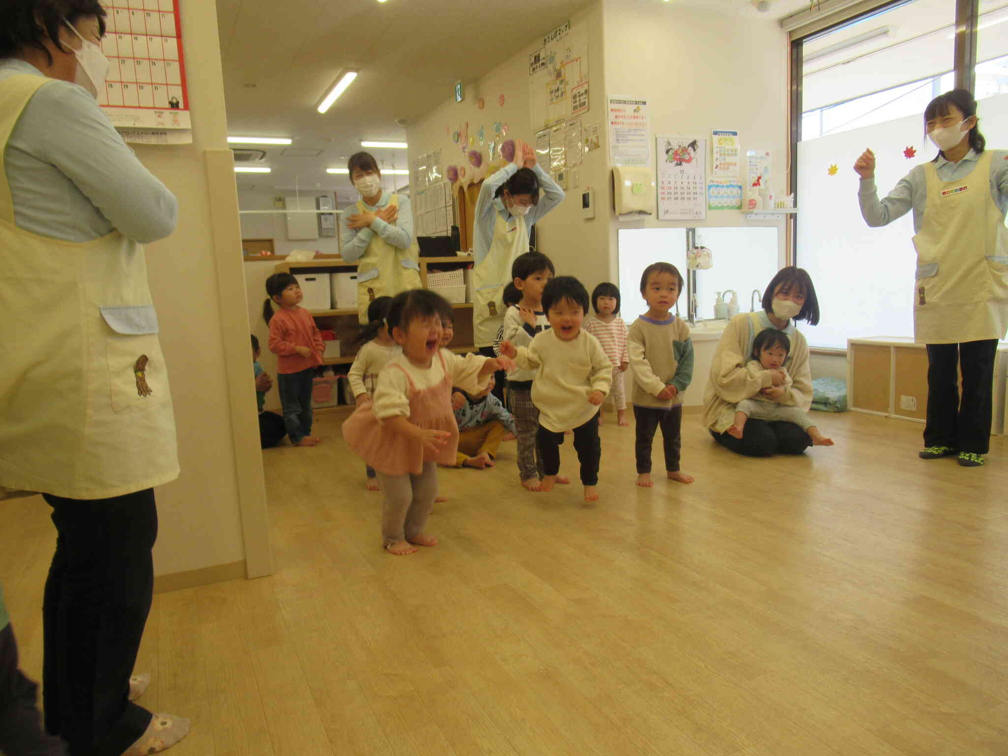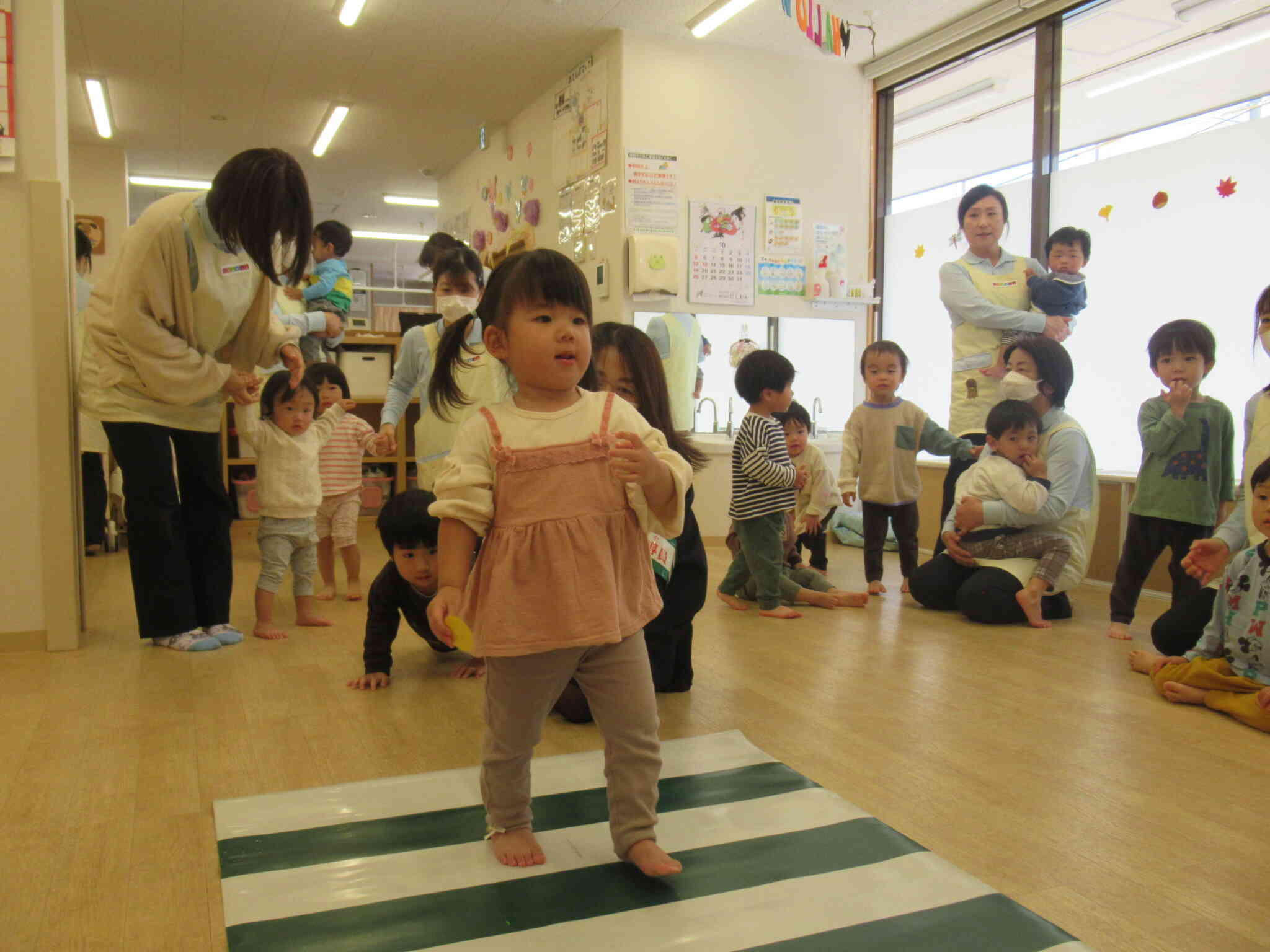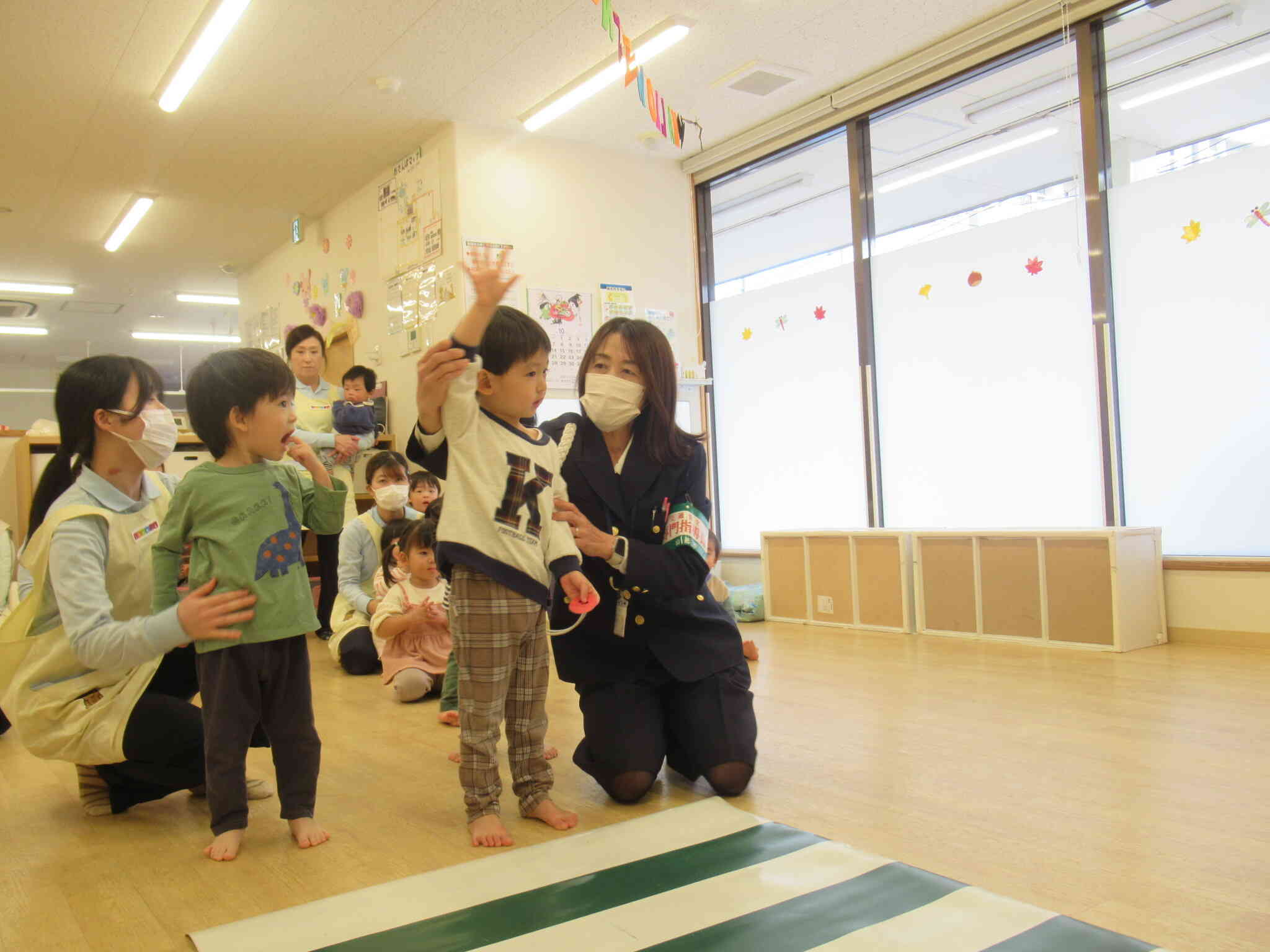 交通安全専門指導員を招いて交通安全教室を行いました。子ども達はどんなお話かな~と興味津々で指導員の話に耳を傾けます。信号機カラー「これは何色?」「青―!」「黄色!」「赤!」と元気よく答えます。今回は横断歩道の渡り方について学びました。「手をあげて右見て左見てもう一度右見て渡ります!」横断歩道を渡りきったら選んだ信号機カラーをペッタン!「上手に渡れたね♪」最後は動物になりきってダンス!