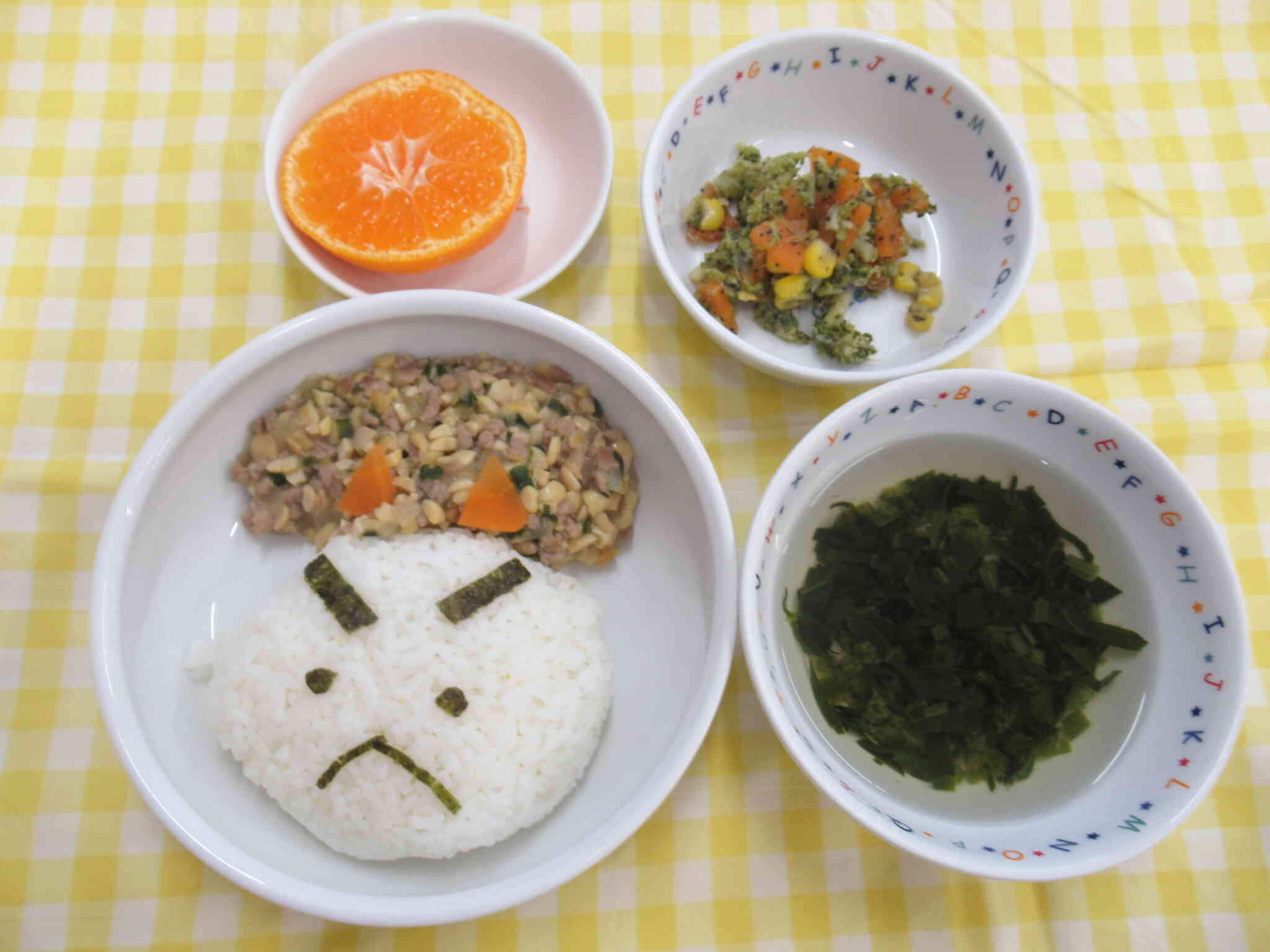 みんなが楽しみにしていた節分給食のメニューは、肉味噌なっとう丼・わかめのすまし汁・ブロッコリーのごま和え・みかんです。