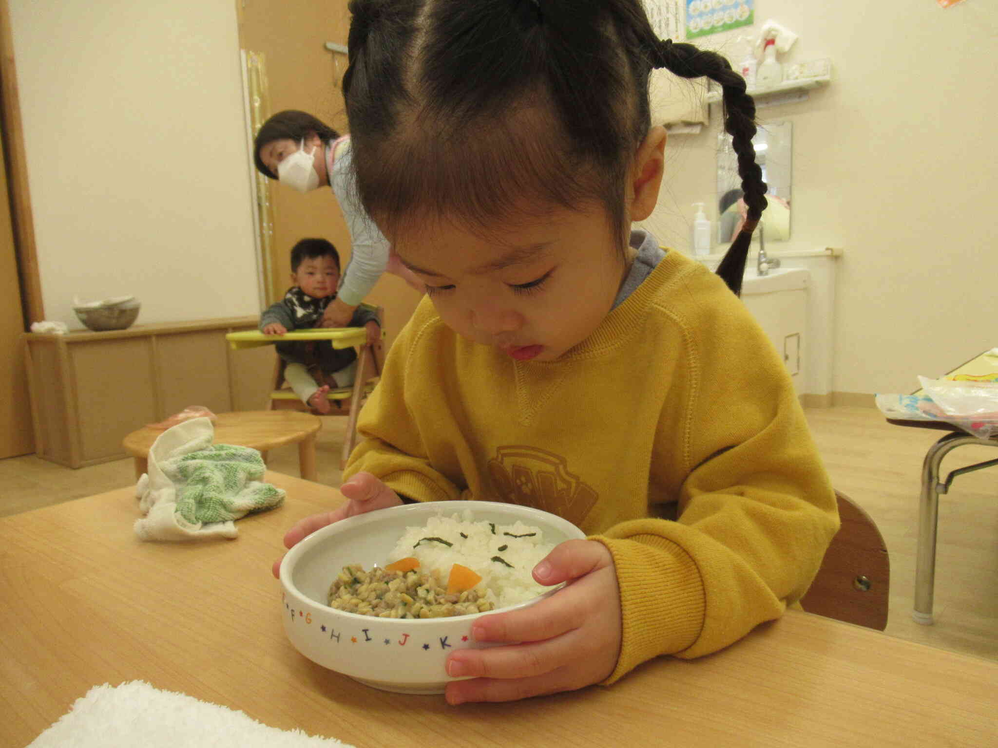 肉味噌なっとう丼が可愛い鬼に大変身!鬼の顔をジーっと見つめたり、「みて、おに!」「おいしい!」と言いながら喜んで食べたりしてとっても楽しい給食の時間になりました。