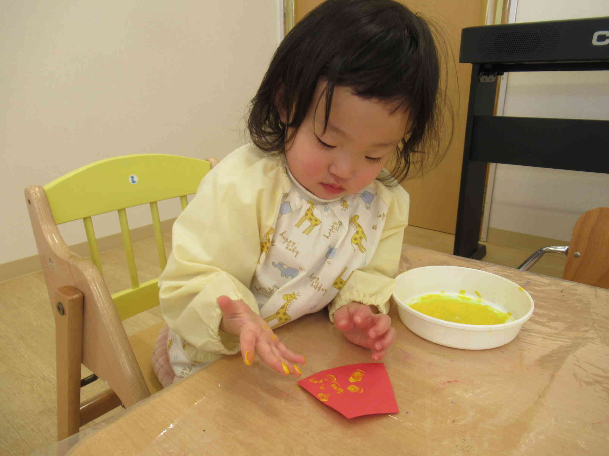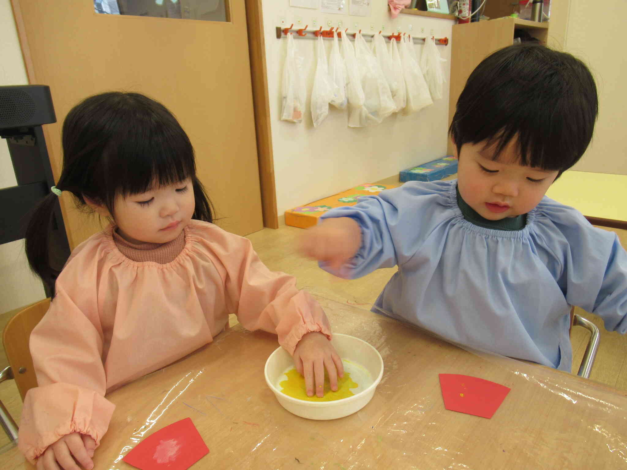 おひな様とおだいり様の着物の台紙に白と黄色の絵の具で指スタンプをして模様をつけ、ポンポンとリズム良くスタンプしたり、手の平全体で豪快に模様をつけたりとひとりひとり個性のある着物が出来上がりました。