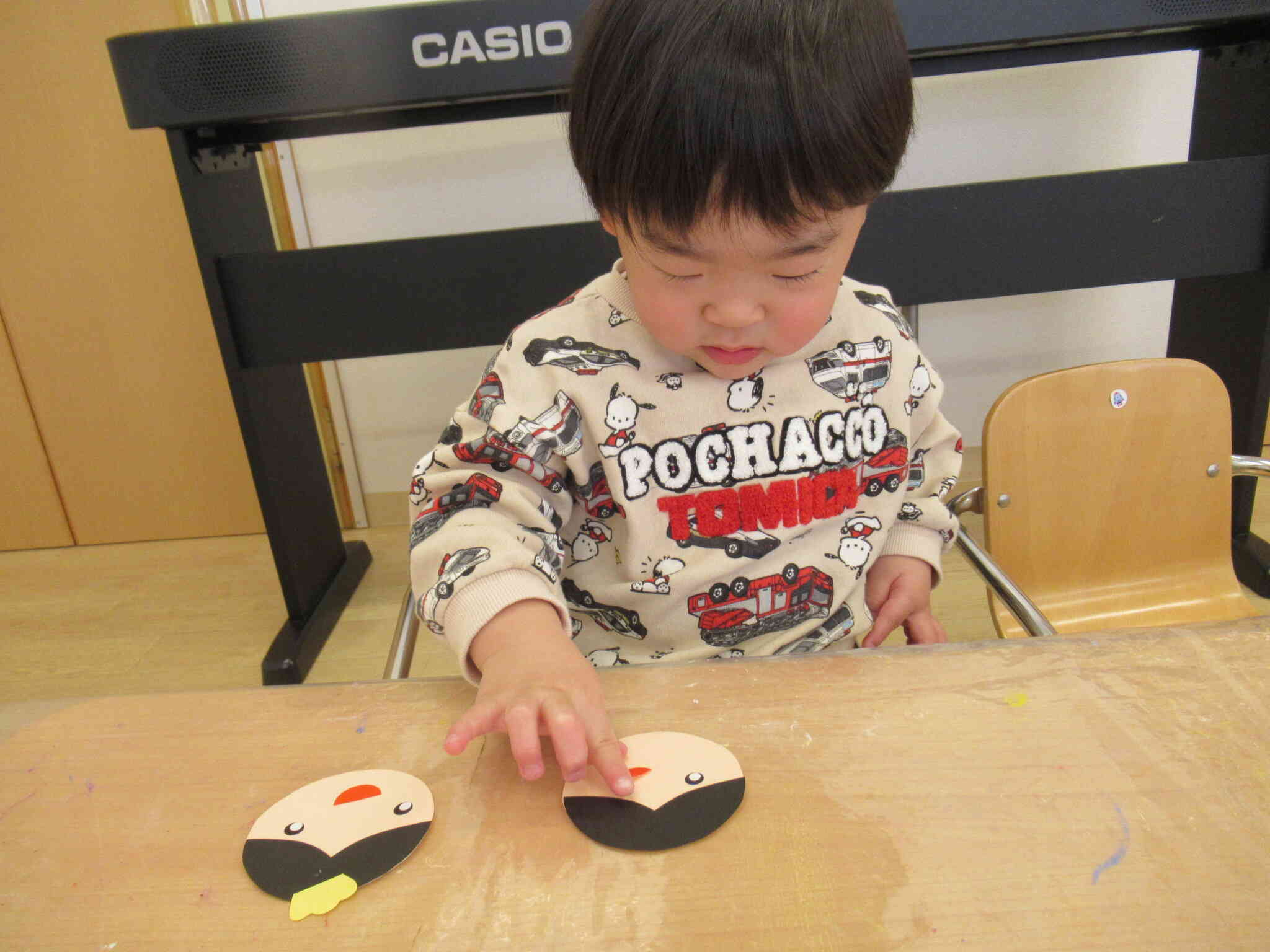 顔のパーツ貼りでは、顔の位置を確認しながら貼っている姿に成長を感じました。