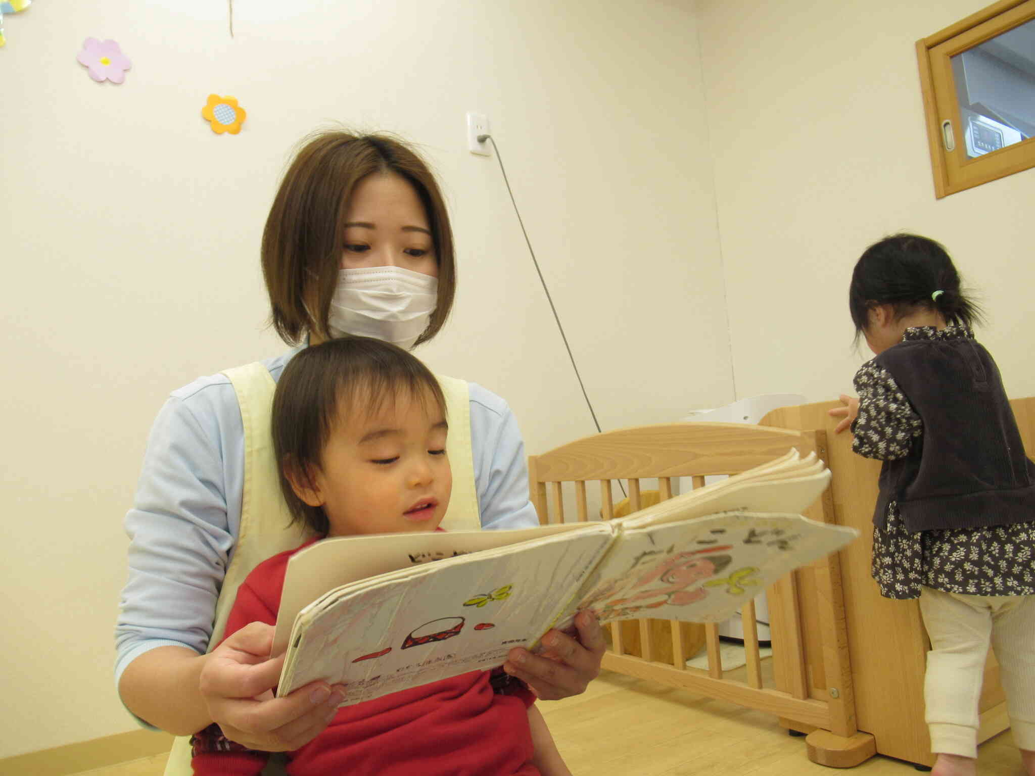 本棚から絵本を選んで「これ読んで。」と保育者にところに持ってきて膝の上に座り読んでもらい満足そうな表情を見せながら楽しい時間を過ごしています。