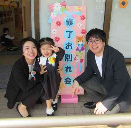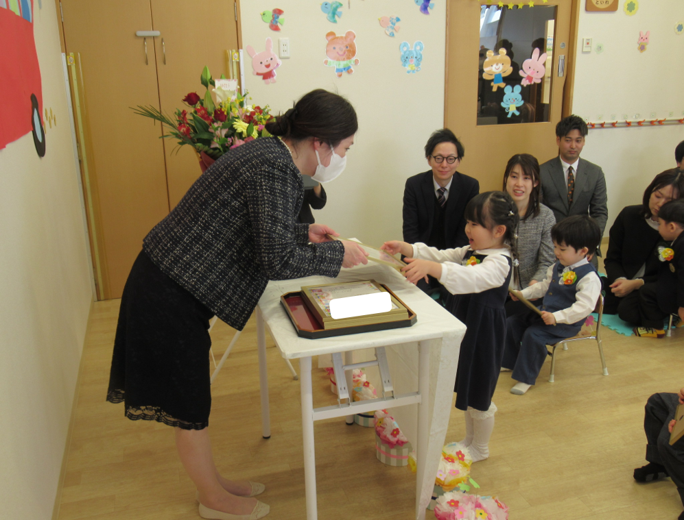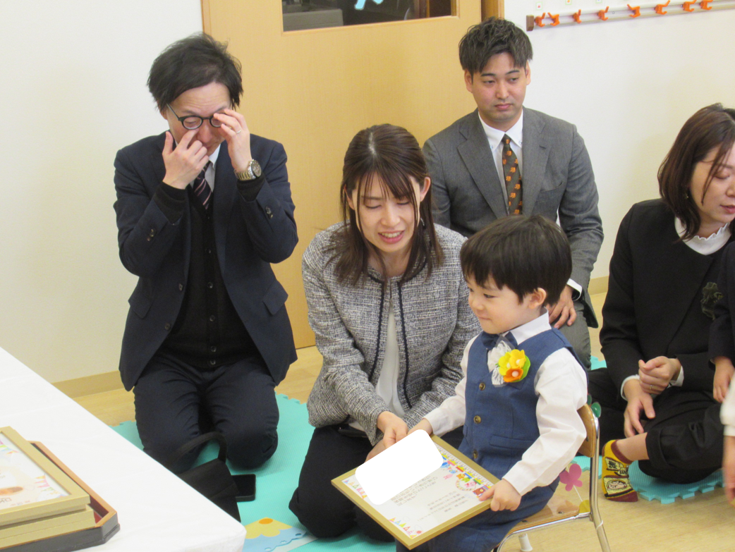 担任の先生から名前を呼ばれると「はい!」と元気よく返事をし、園長先生から修了証書を上手に受けとる姿に改めて成長を感じてとても感動しました。