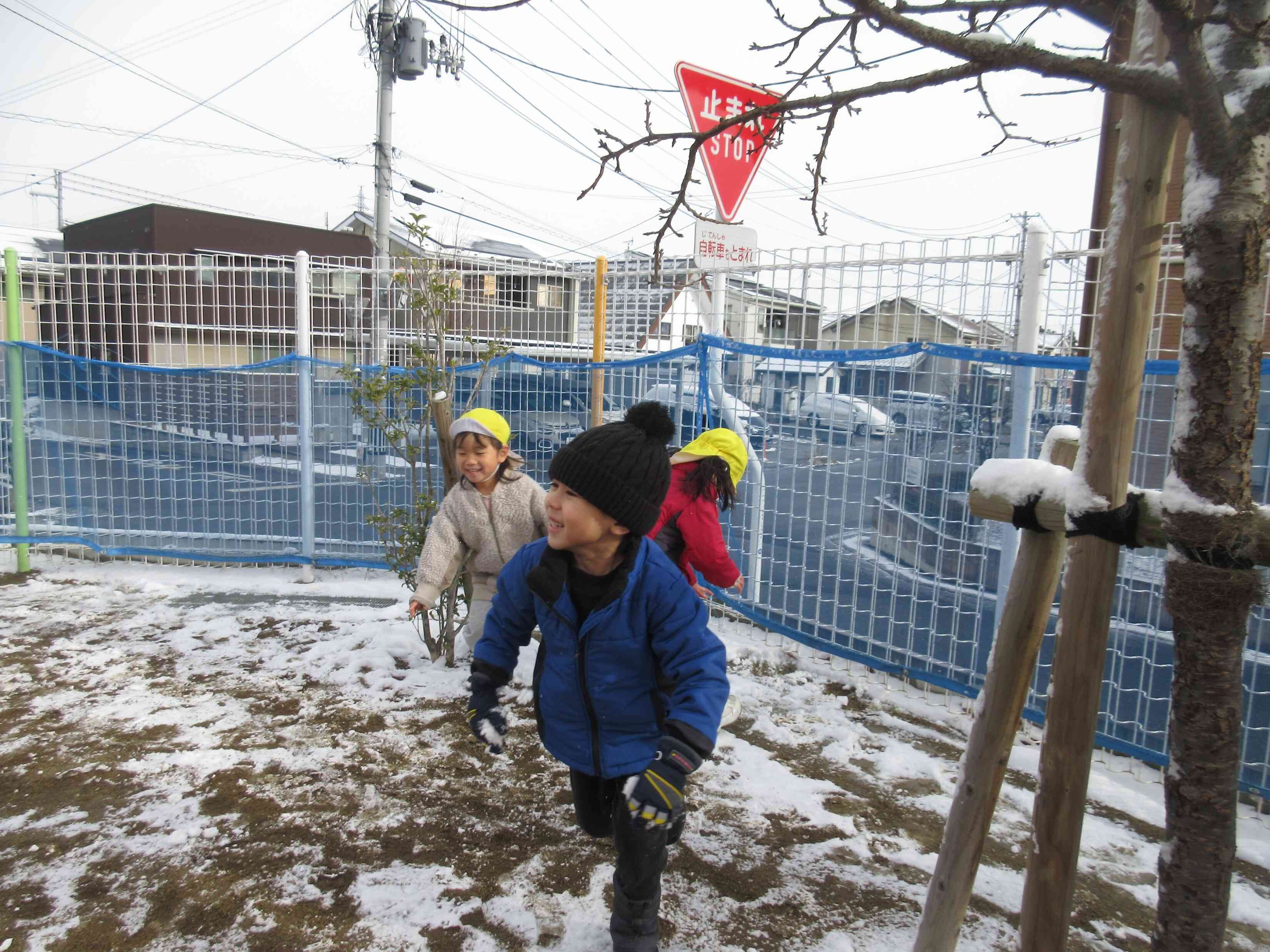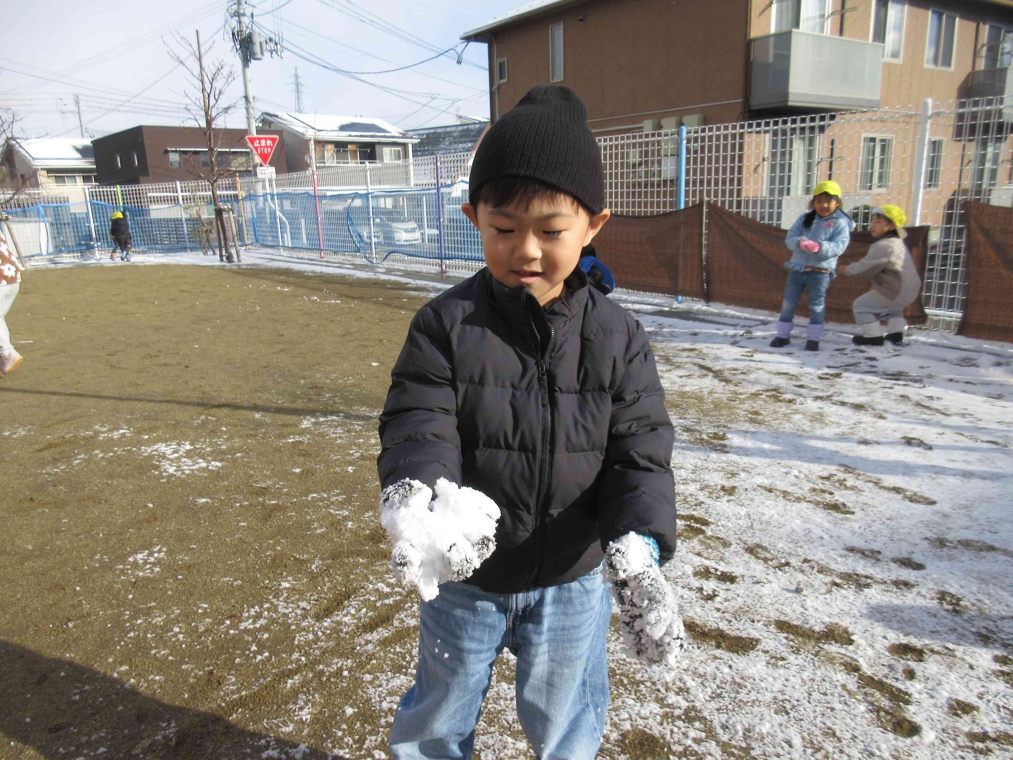 12月4日は初雪でしたね。園庭に薄く雪が積もっていてプチ雪合戦を楽しみました。