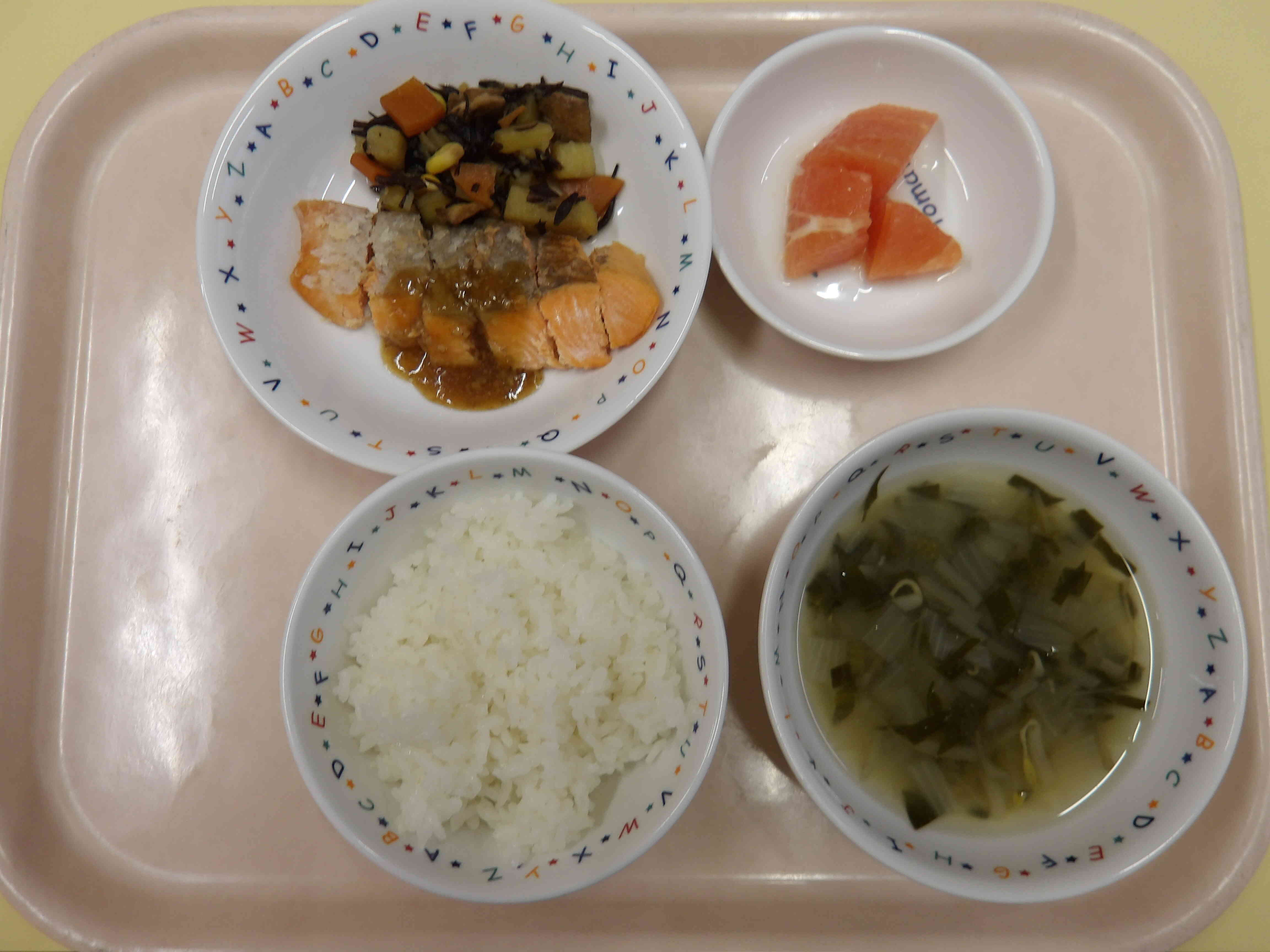 今日の給食は、ごはん、キャベツのおみそ汁、かれいの中華漬け焼き、ひじきサラダ、オレンジです! おやつは、カレー風味のじゃこピラフです。大好評でおかわりもしていました♬