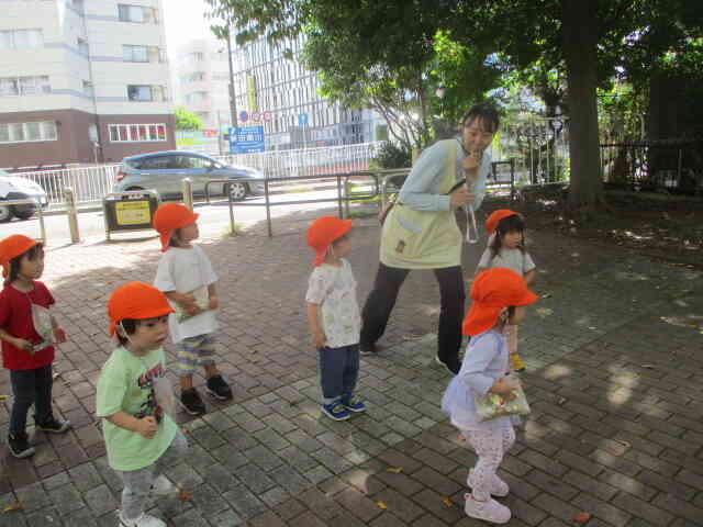 秋の風に吹かれて、お散歩を楽しんでいる0歳児クラスさんです!