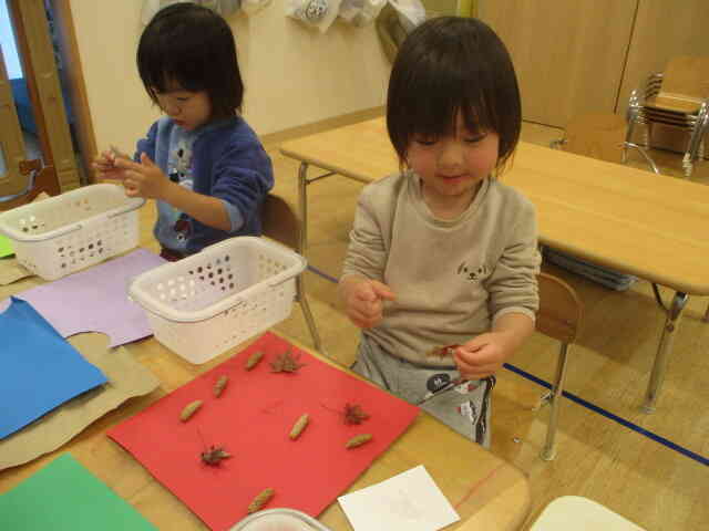 2歳児クラスさんは自分で拾ってきたドングリや松ぼっくりをボンドで貼っています!