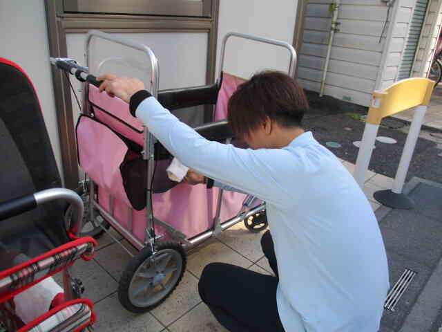 ニチイキッズ与野駅前保育園では、定期的にお散歩カートの掃除をしています。