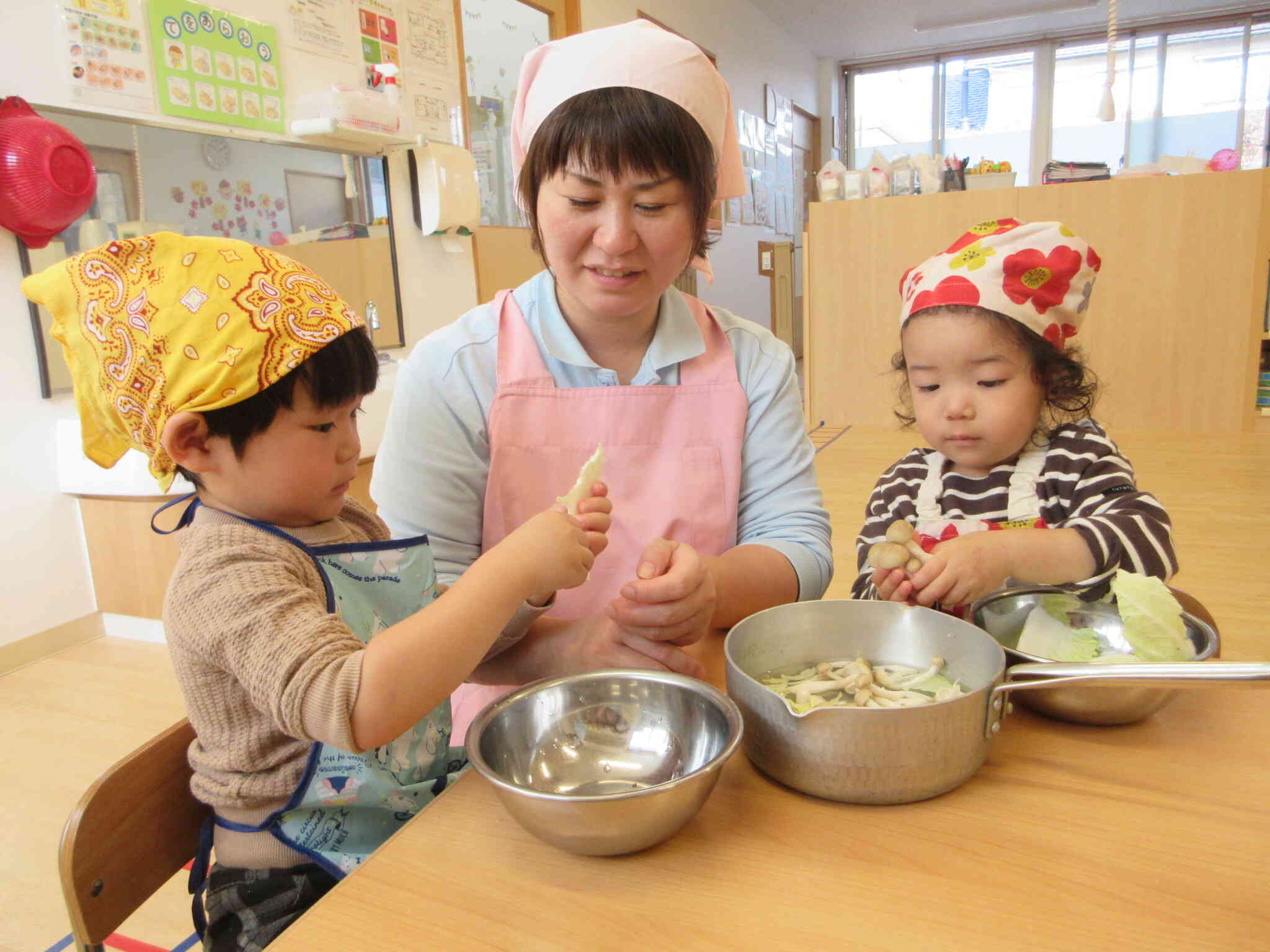 白菜やしめじを一生懸命ちぎり、お鍋に投入!ものすごく集中していました。