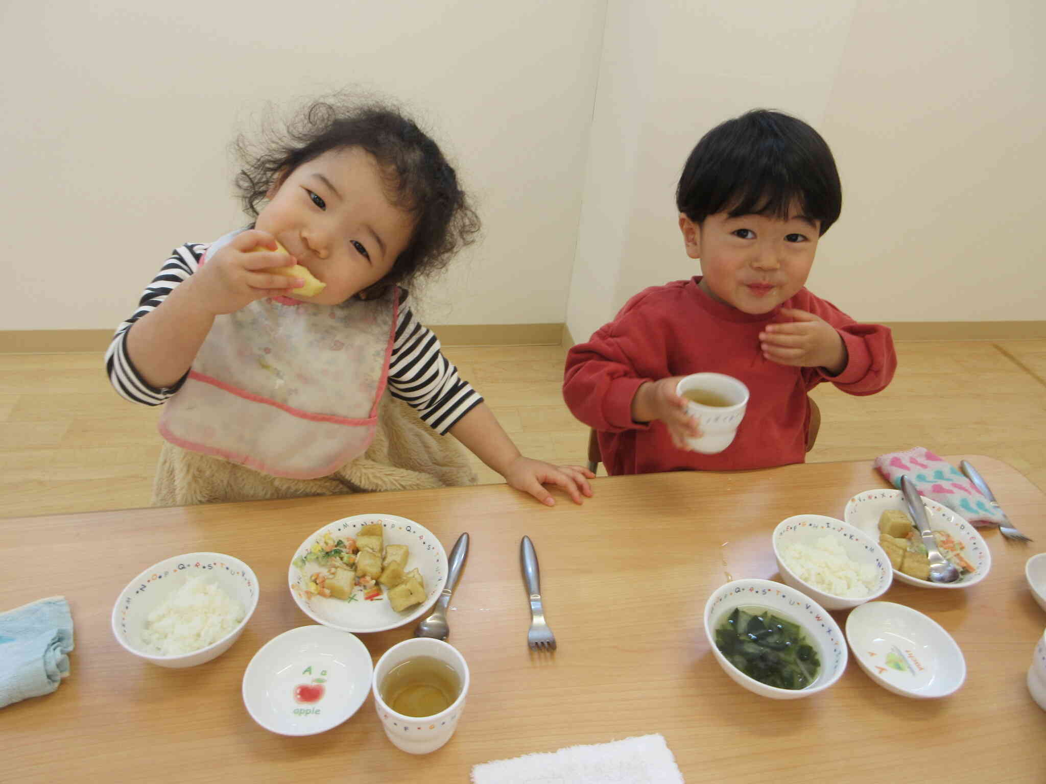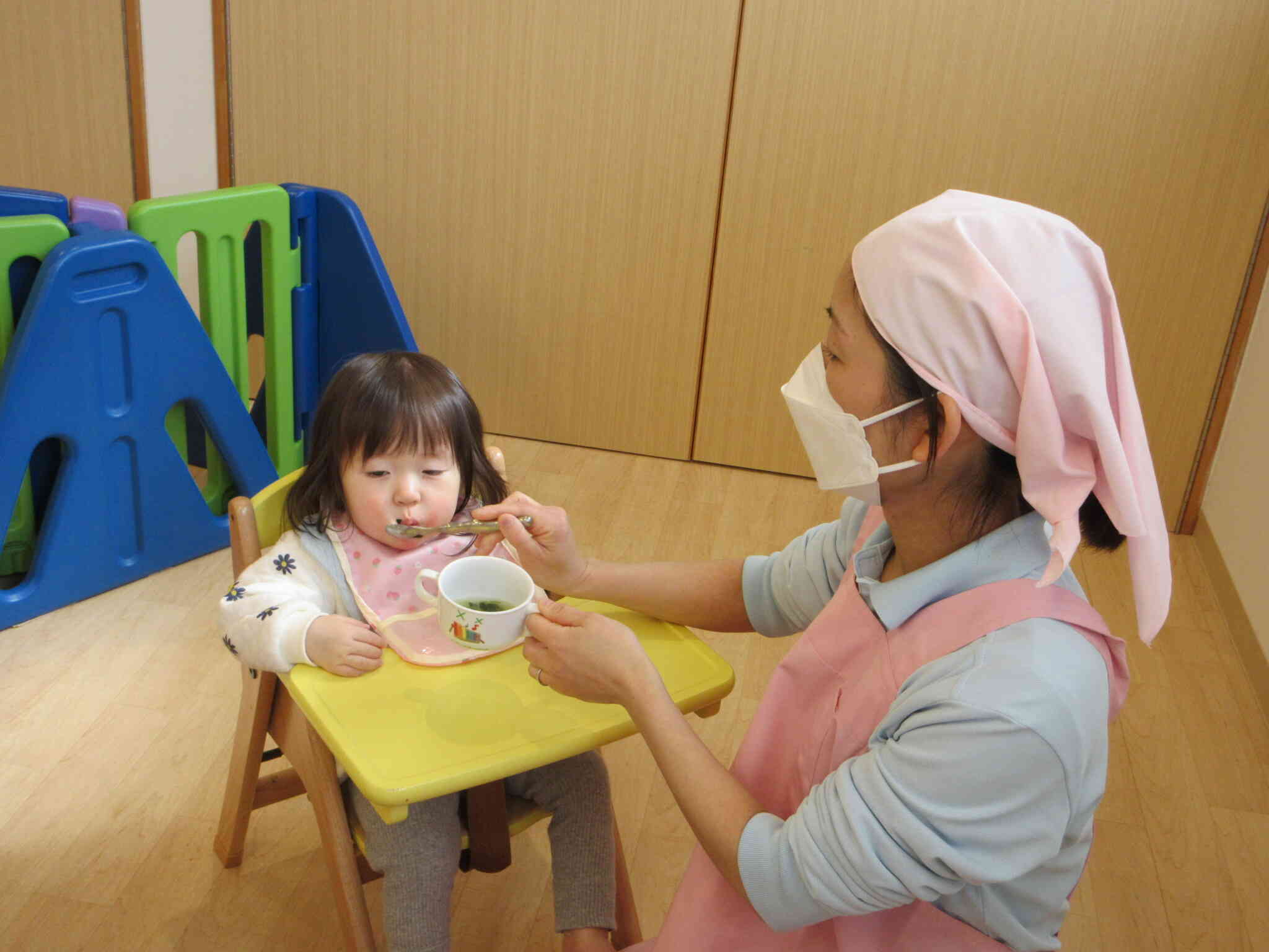 月齢の高い子どもたちは、持ち手付きマグで自分でお汁を飲めるようになりました
